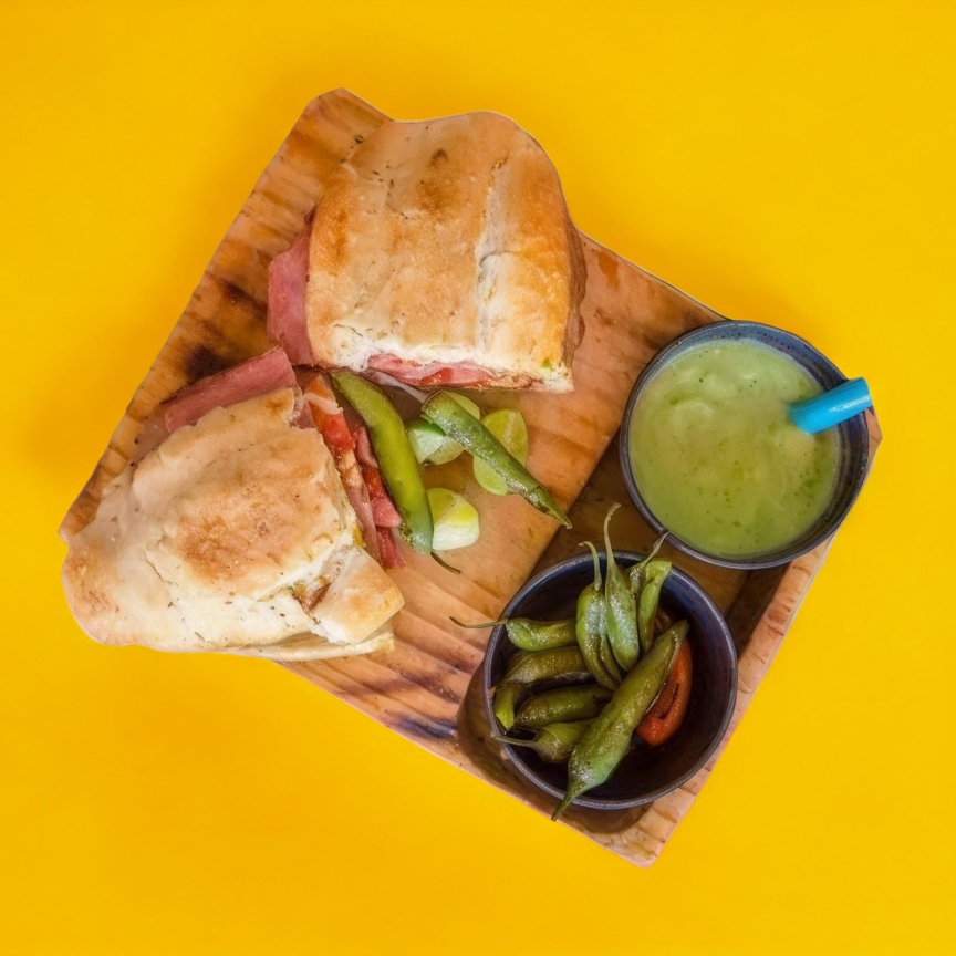 Torta de jamon, frijoles, aguacate, jitomate, cebolla, salsa chipotle, mayonesa, mantequilla, chiles toreados y limones.