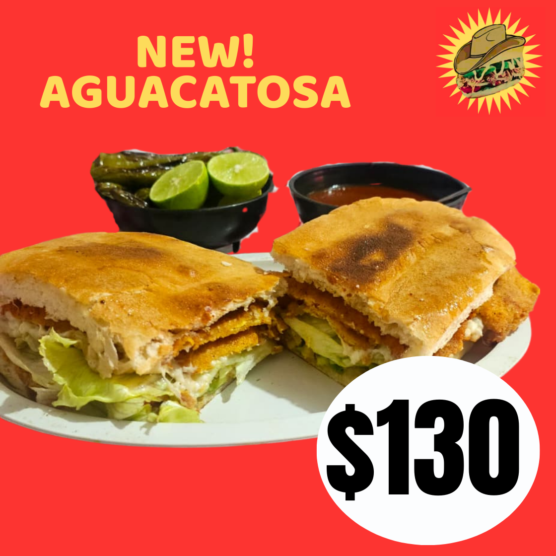 Torta de milanesa: pan para torta grande, pierna, Queso oaxaca, frijoles, aguacate, jitomate, cebolla, salsa chipotle, mayonesa, mantequilla, chiles toreados y limones. + 1 refresco de regalo