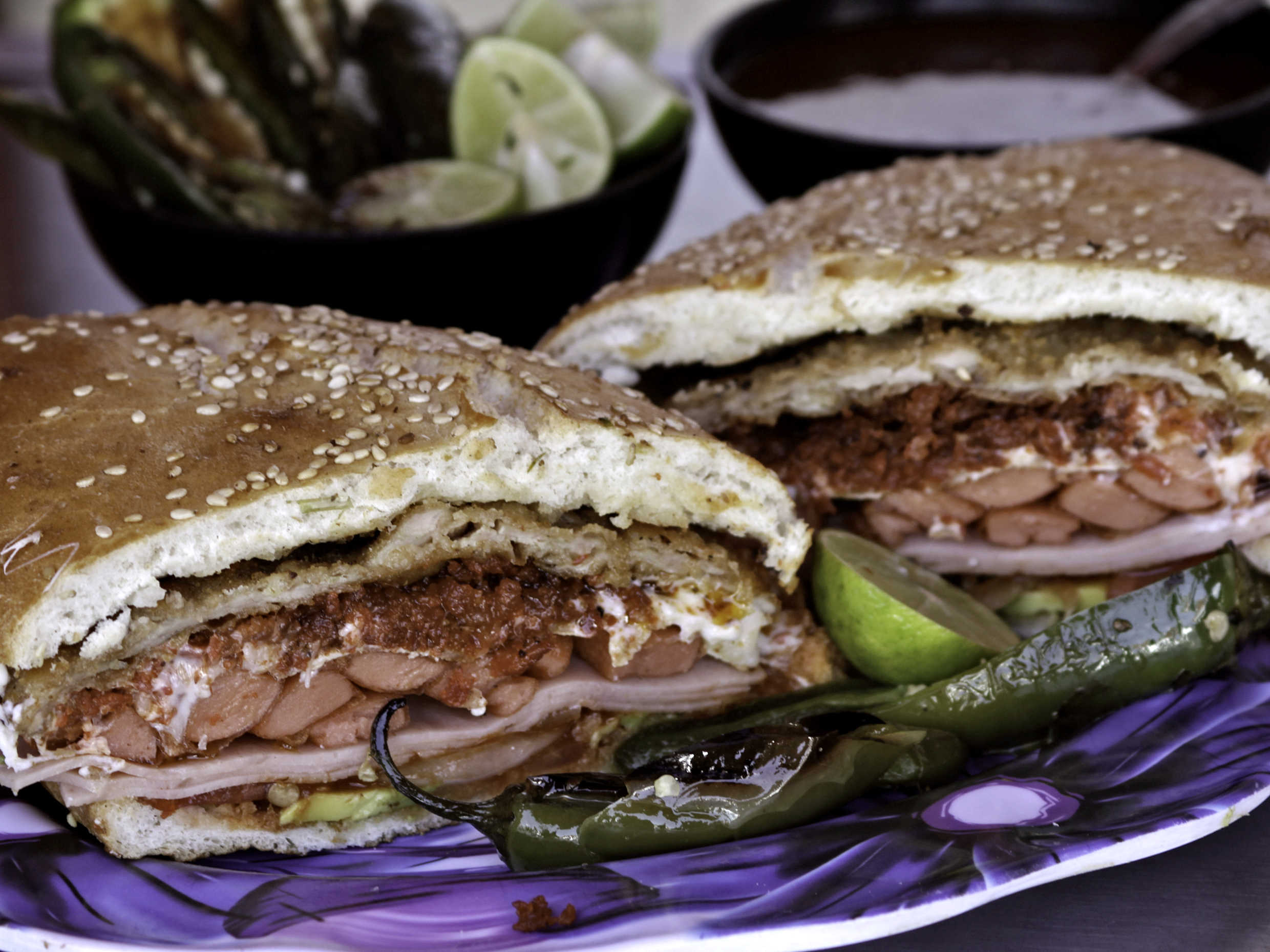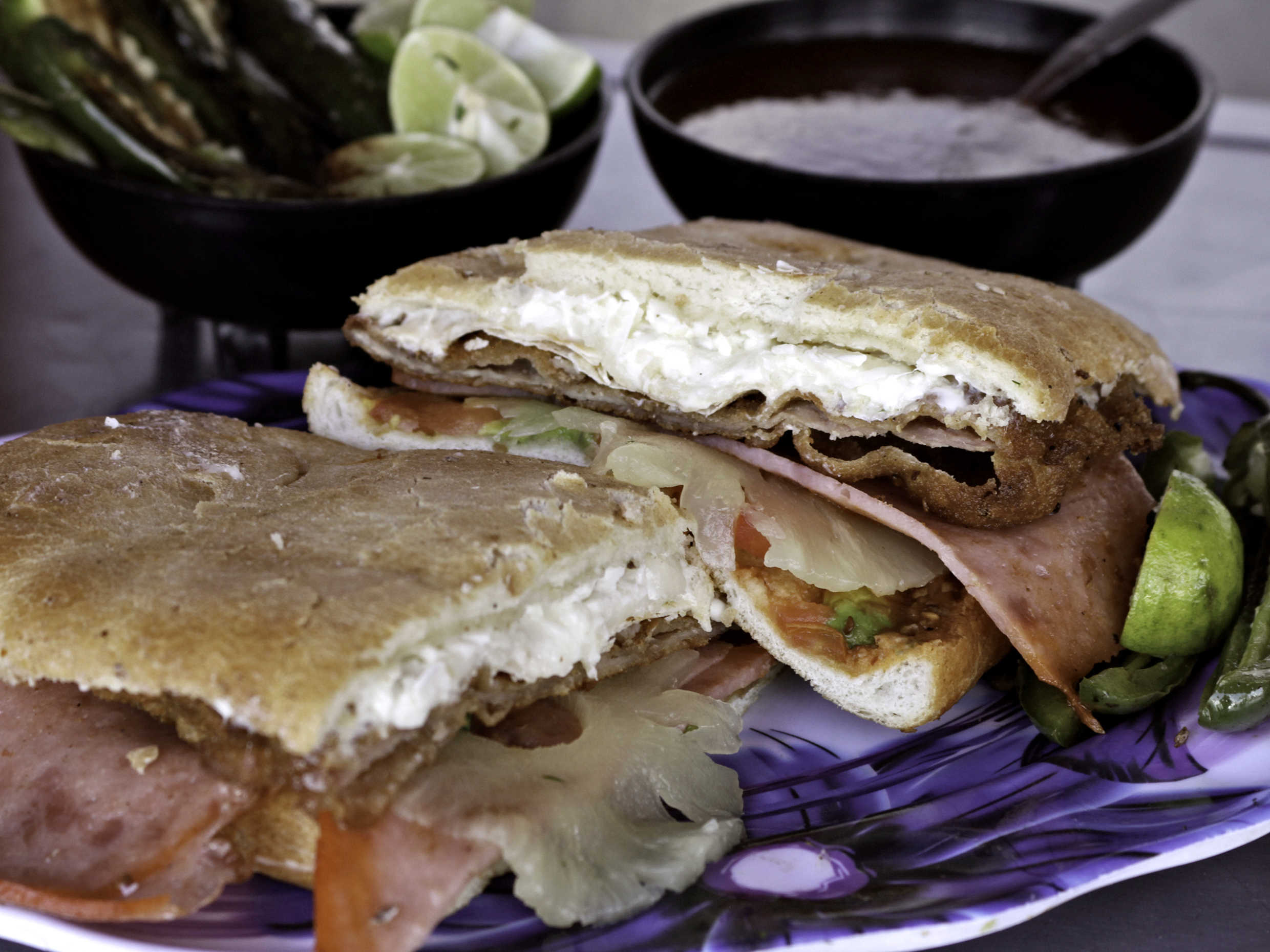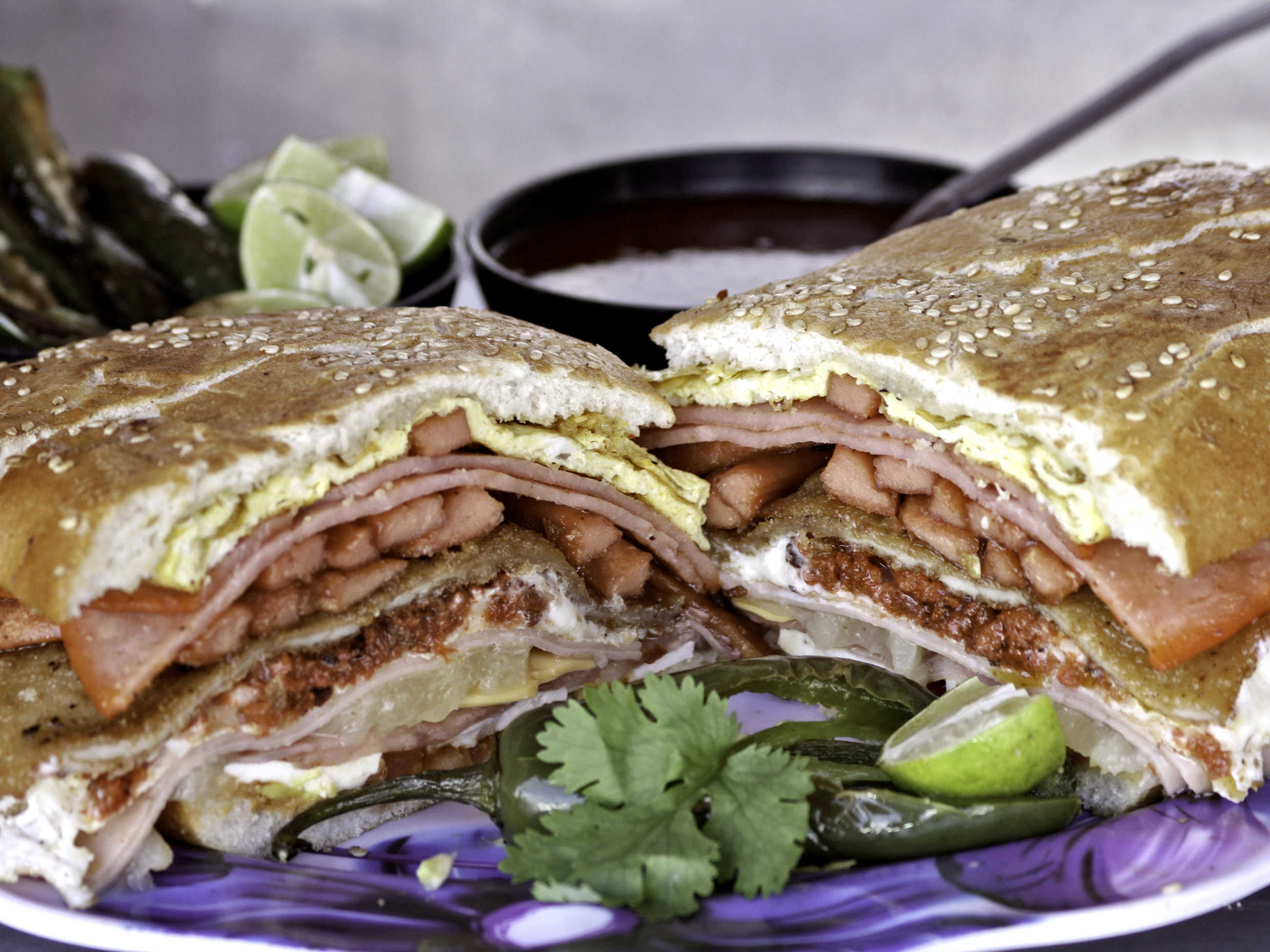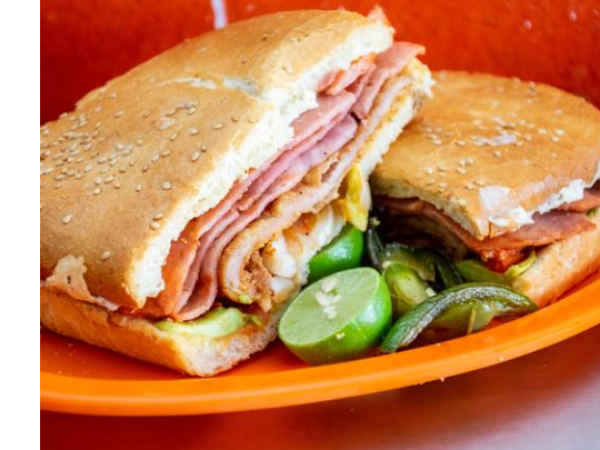 Torta de bolillo grande (30 cm de largo por 13 cm de ancho), aguacate, jitomate, cebolla, salsa chipotle, crema mantequilla para calentar, jamón, panela, oaxaca y queso amarillo, acompañados de chiles toreados y limones.