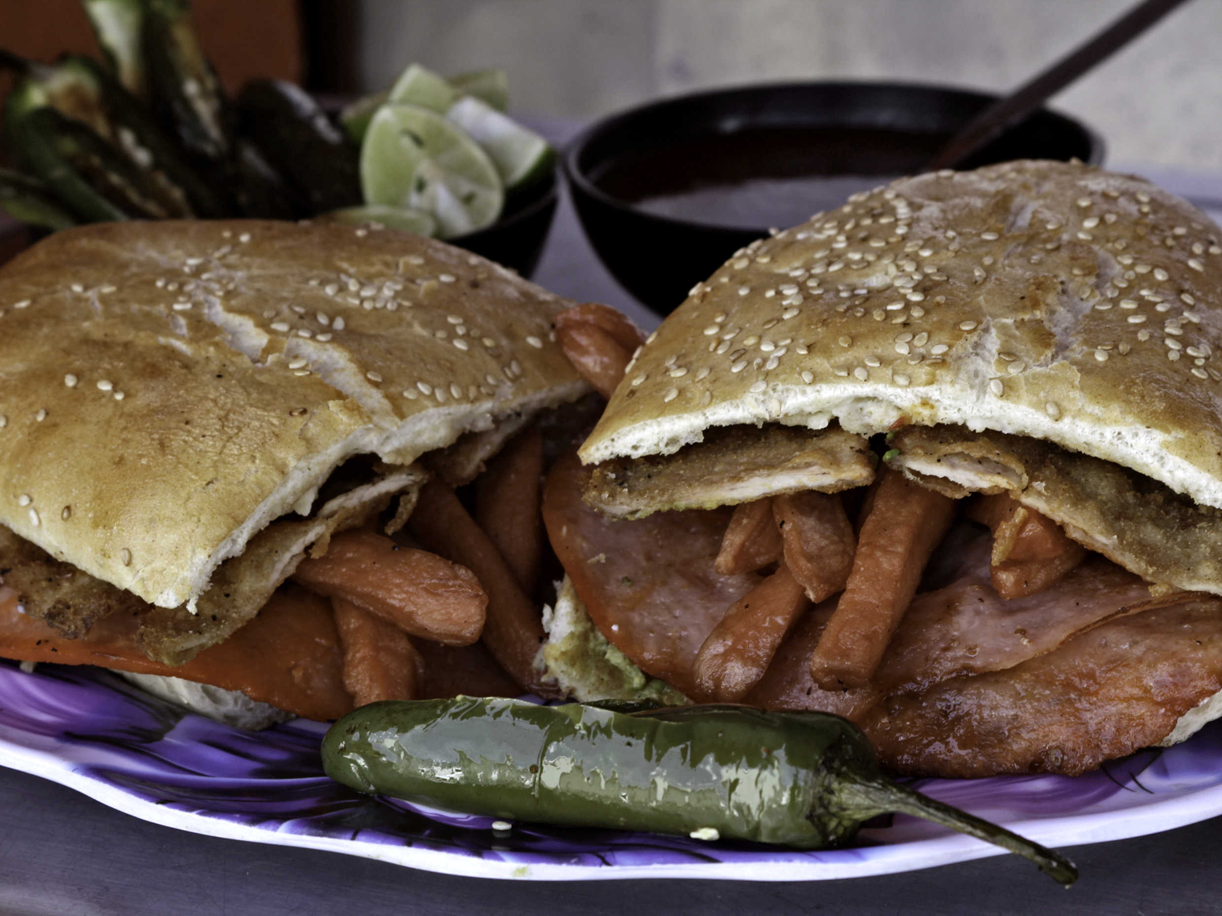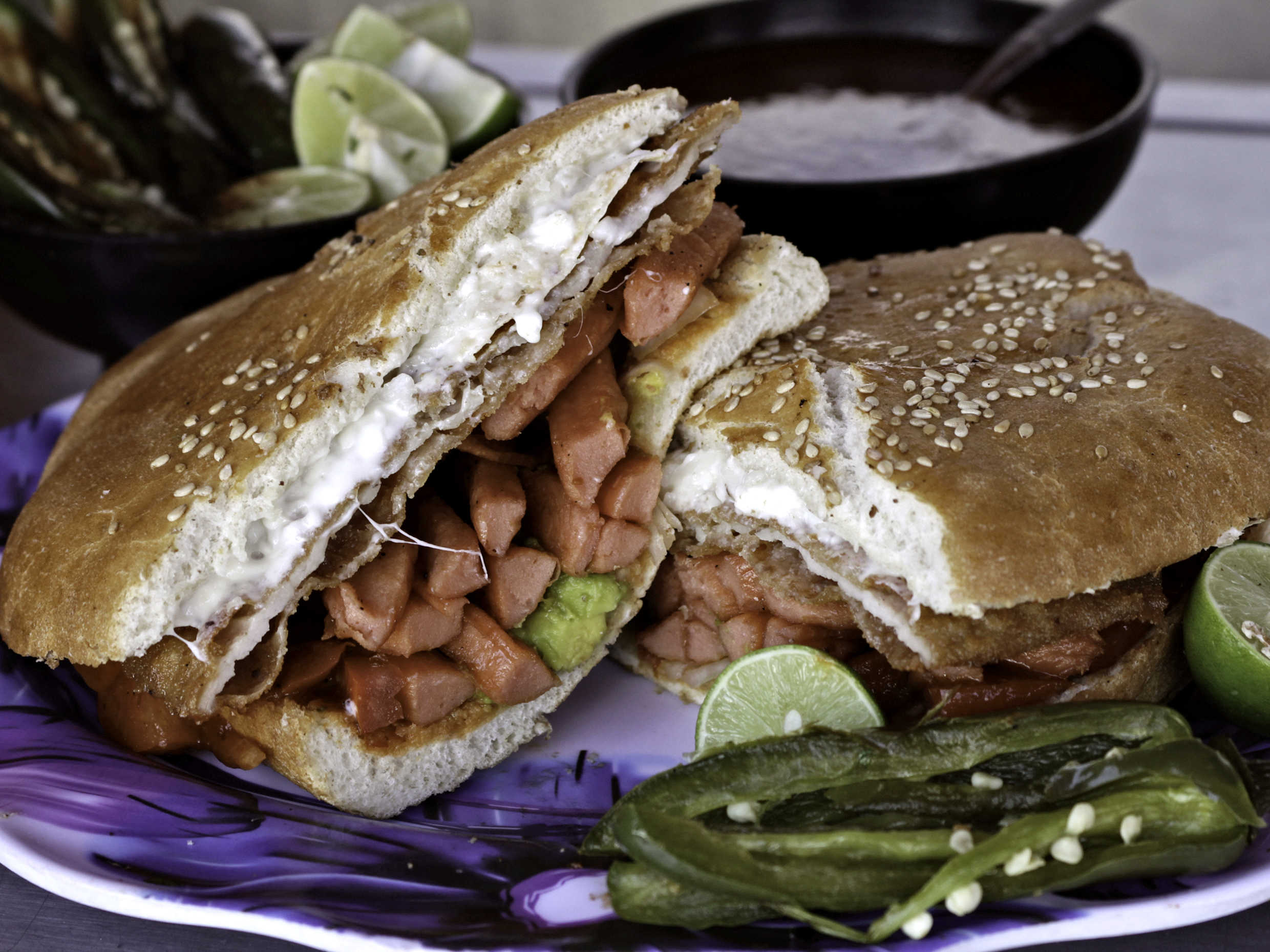 Torta de bolillo grande (30 cm de largo por 13 cm de ancho), rellena de aguacate, jitomate, cebolla, salsa chipotle, crema mantequilla para calentar, viene con milanesa, jamón, chorizo, salchicha y queso oaxaca, acompañados de chiles toreados y limones.