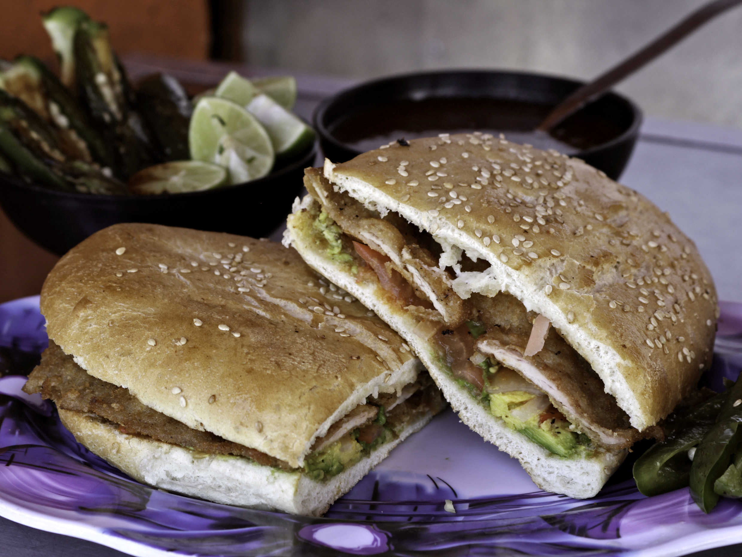 Torta de bolillo grande (30 cm de largo por 13 cm de ancho), rellena de aguacate, jitomate, cebolla, salsa chipotle, crema mantequilla para calentar, acompañados de chiles toreados y limones.