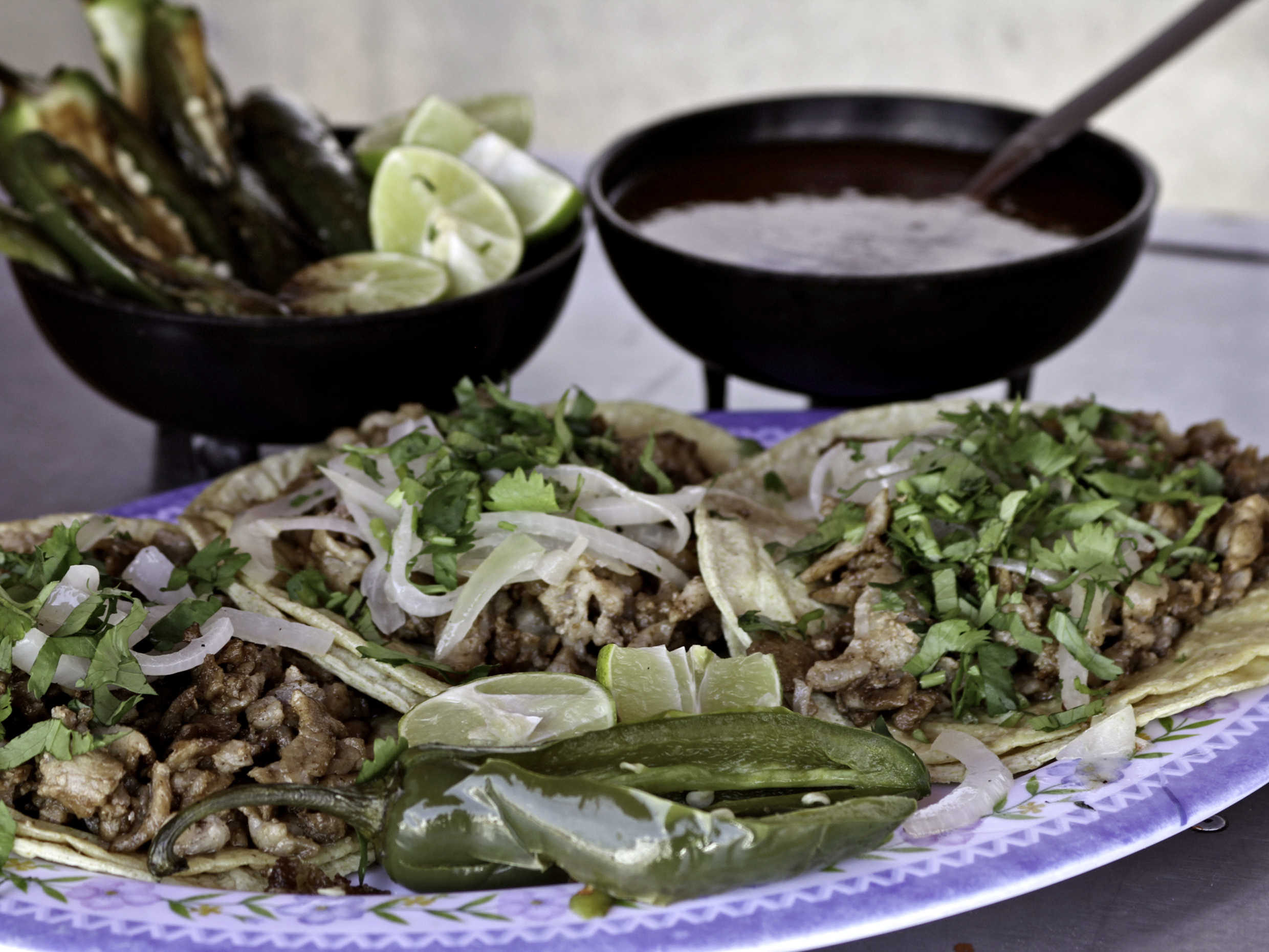 Tres tacos grandes con cilantro, cebolla, limones y salsa chipotle.