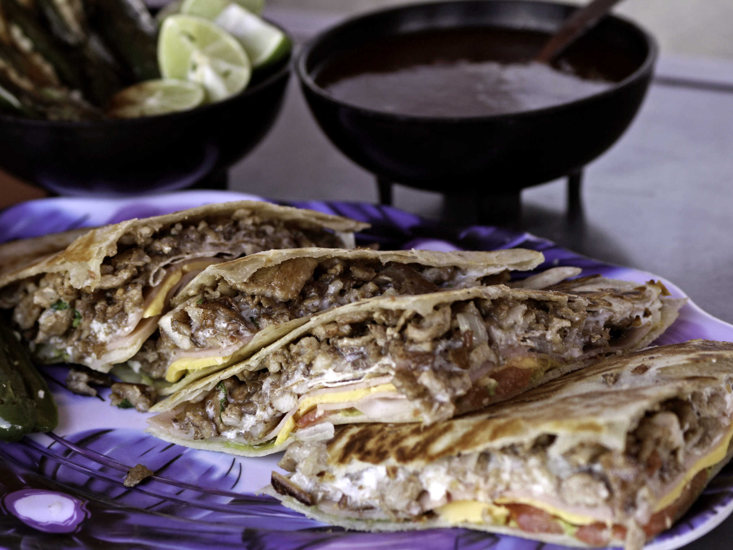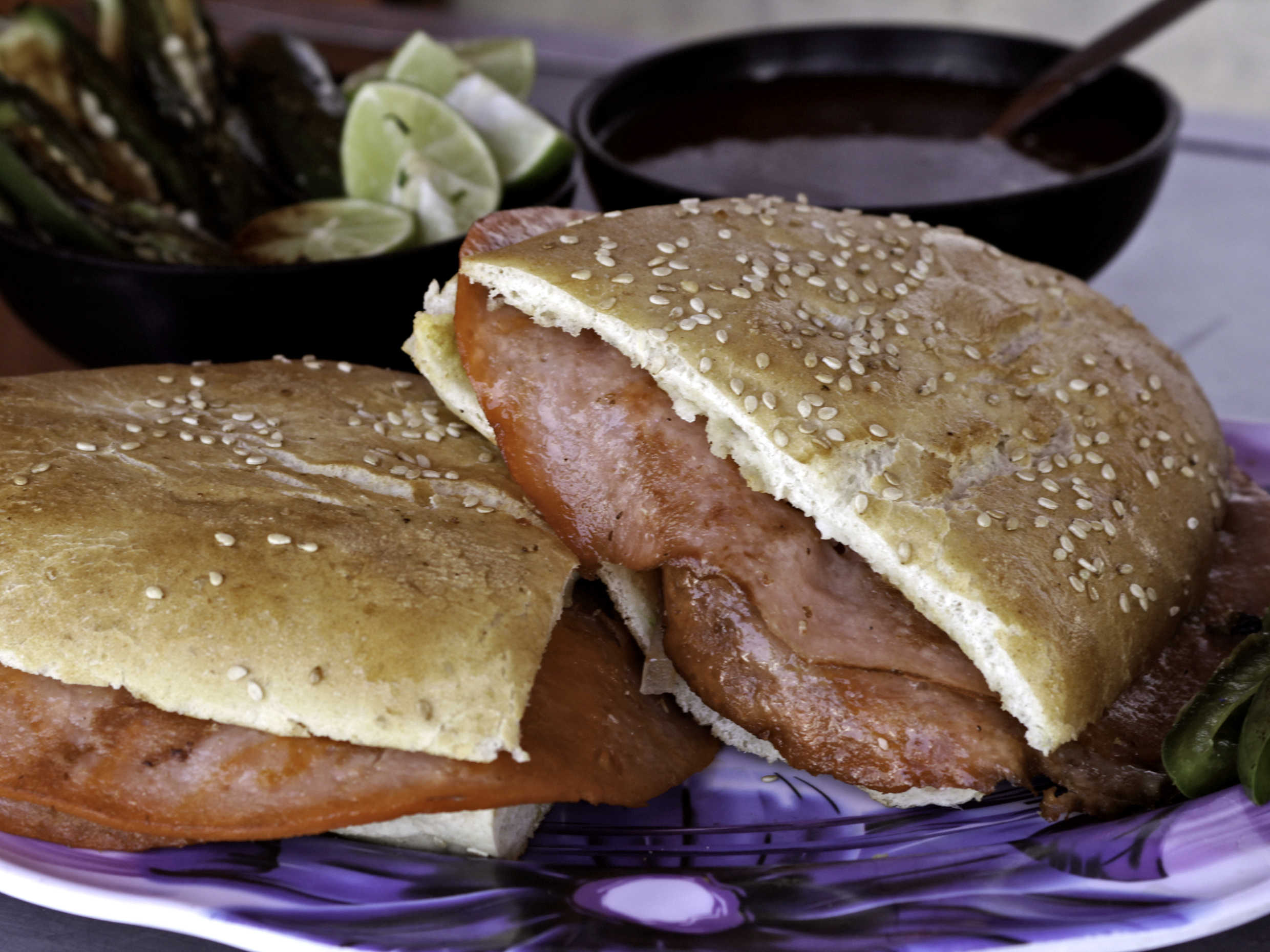 Torta de bolillo grande (30 cm de largo por 13 cm de ancho), rellana de aguacate, jitomate, cebolla, salsa chipotle, crema mantequilla para calentar, viene con bistec, chorizo y queso oaxaca, acompañados de chiles toreados y limones.