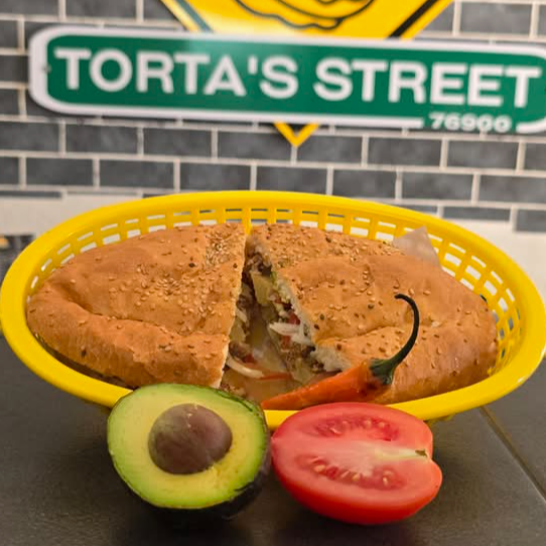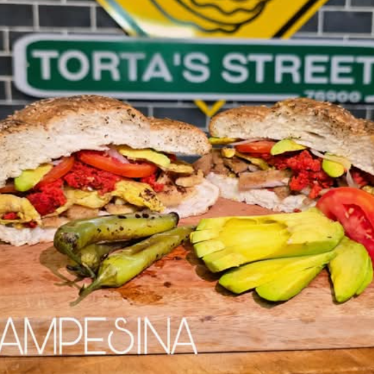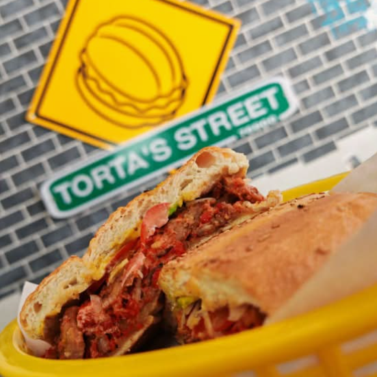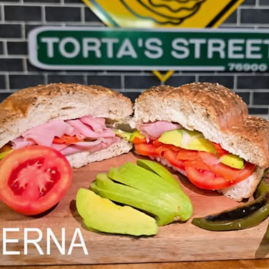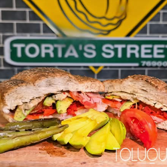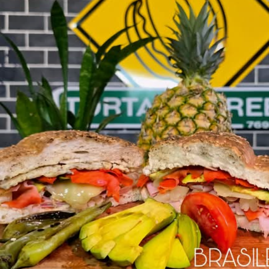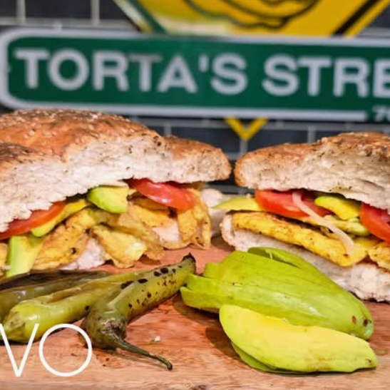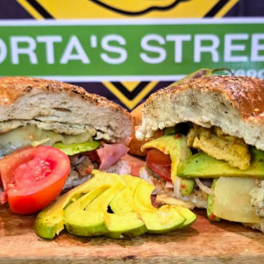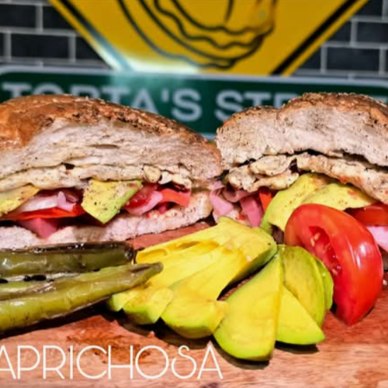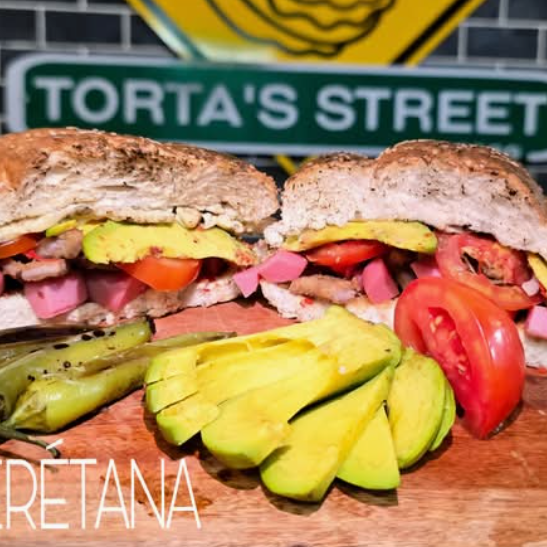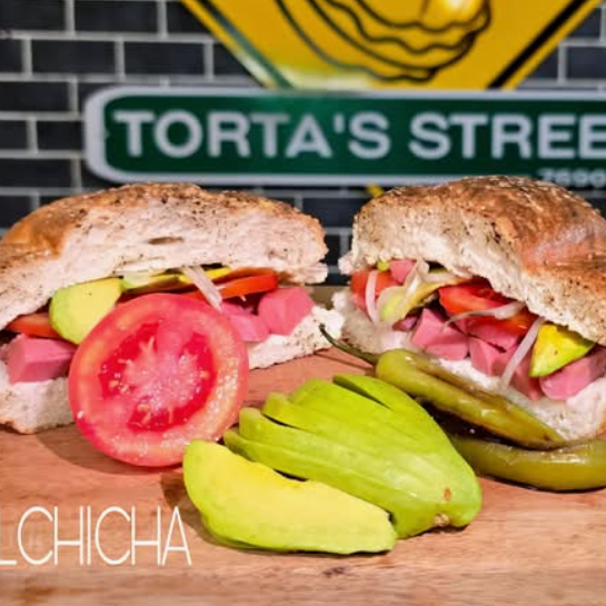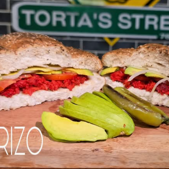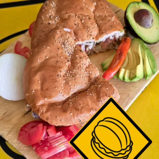 Bocadillo de pan relleno de chorizo, cebolla, tomate, y guacamole.
