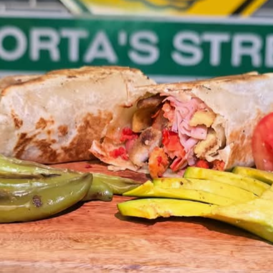 Burrito de milanesa, pierna, quesos y cebolla caramelizada.