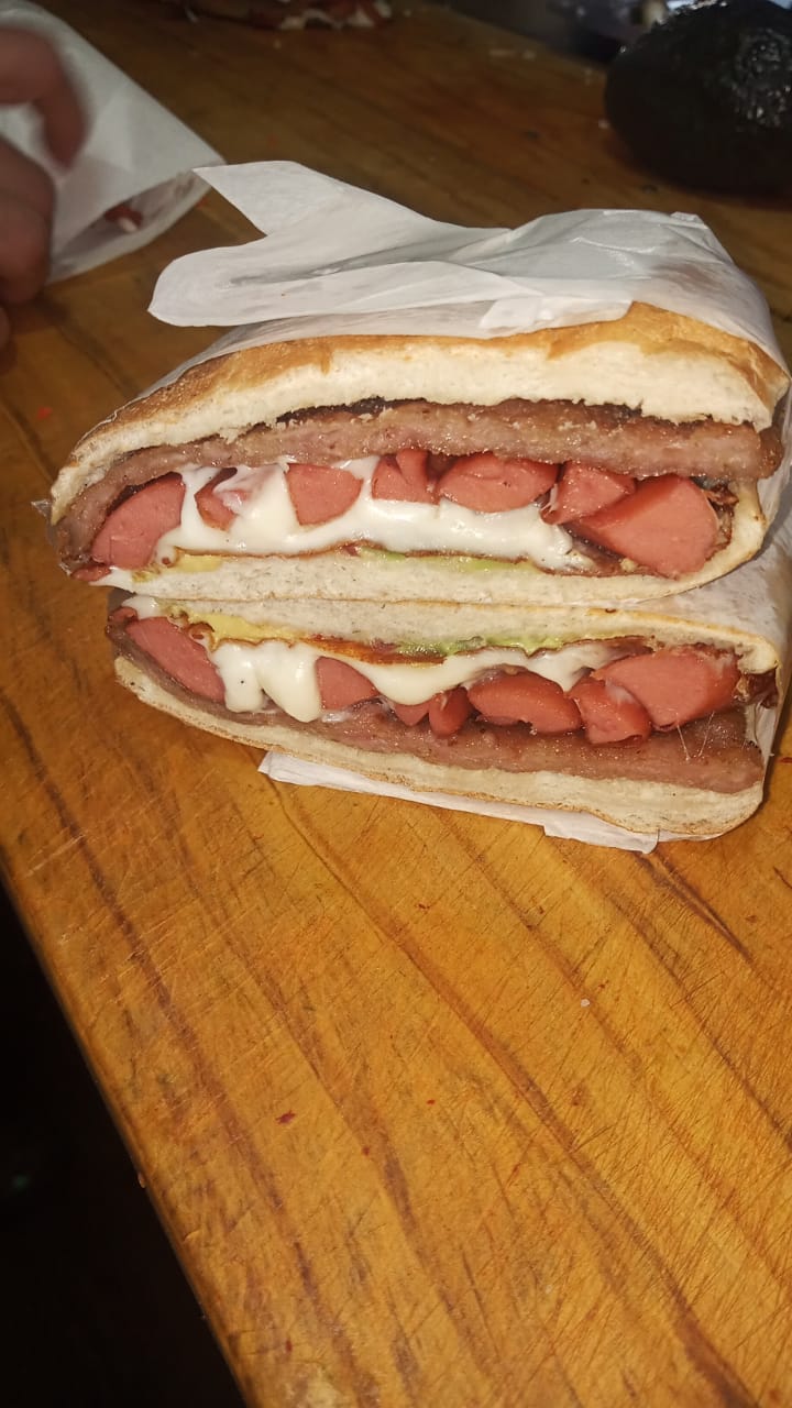 Milanesa salchica quesillo 🥑 jitomate cebolla salsa y chiles mayonesa y frijolitos