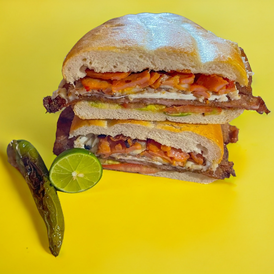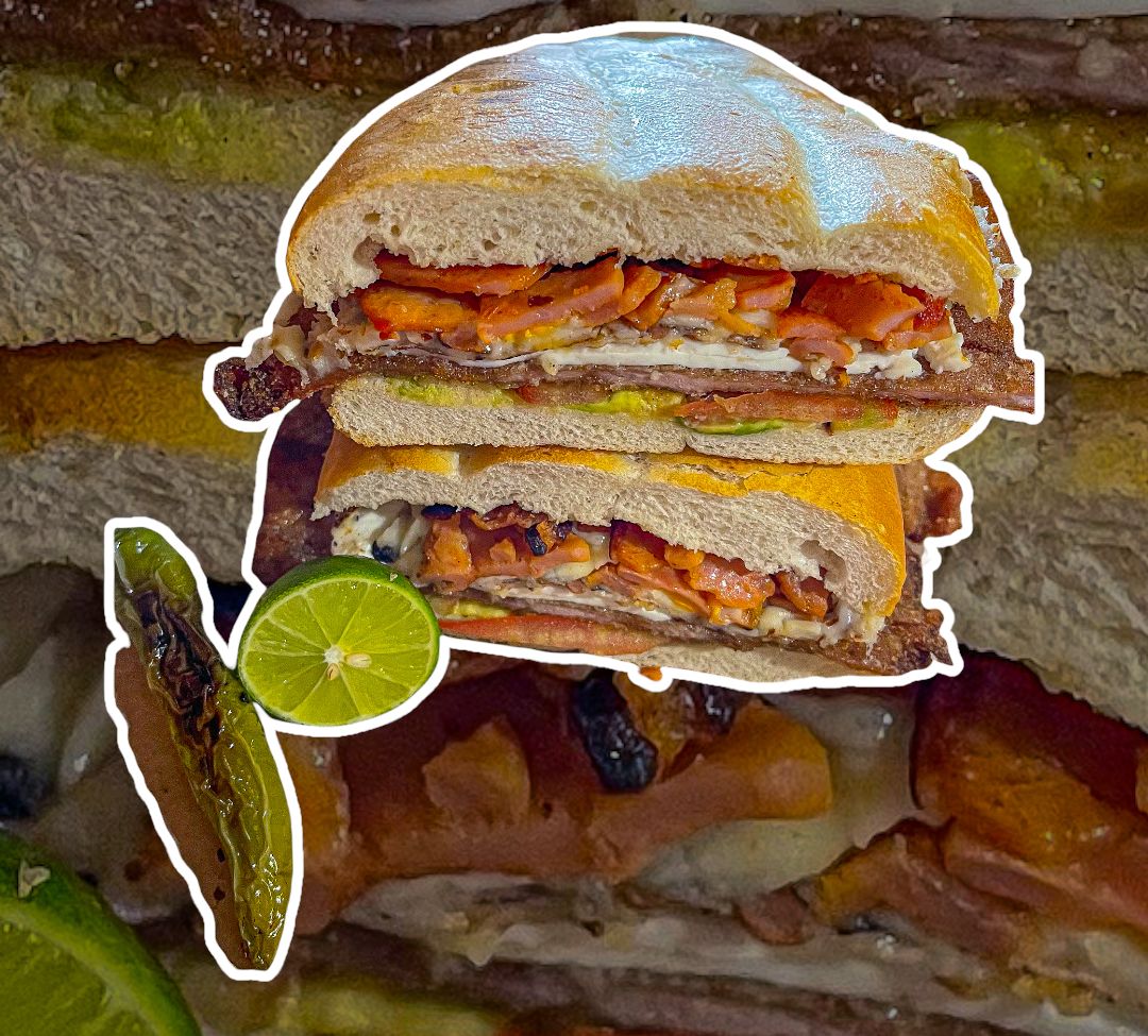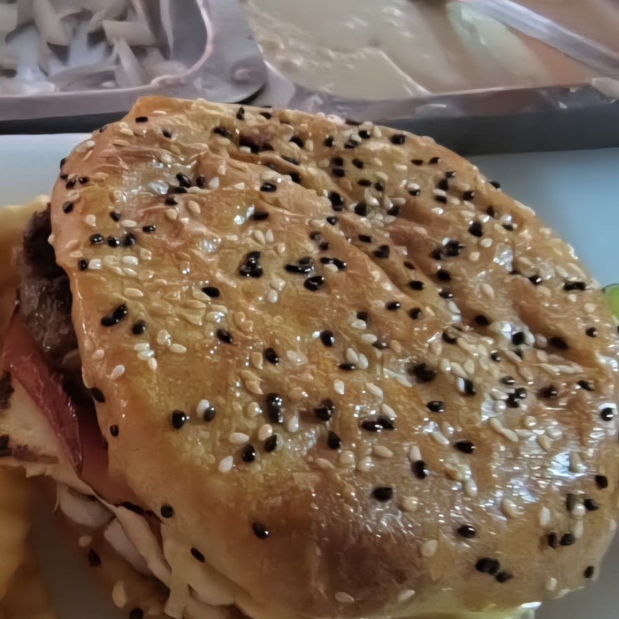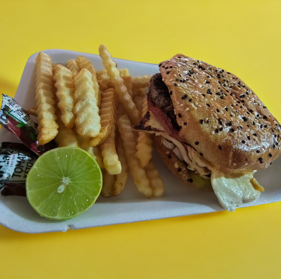 hamburguesa con carne de sirlon, queso Oaxaca, queso amarillo, jamón, queso panela, aguacate, cebolla y jitomate.