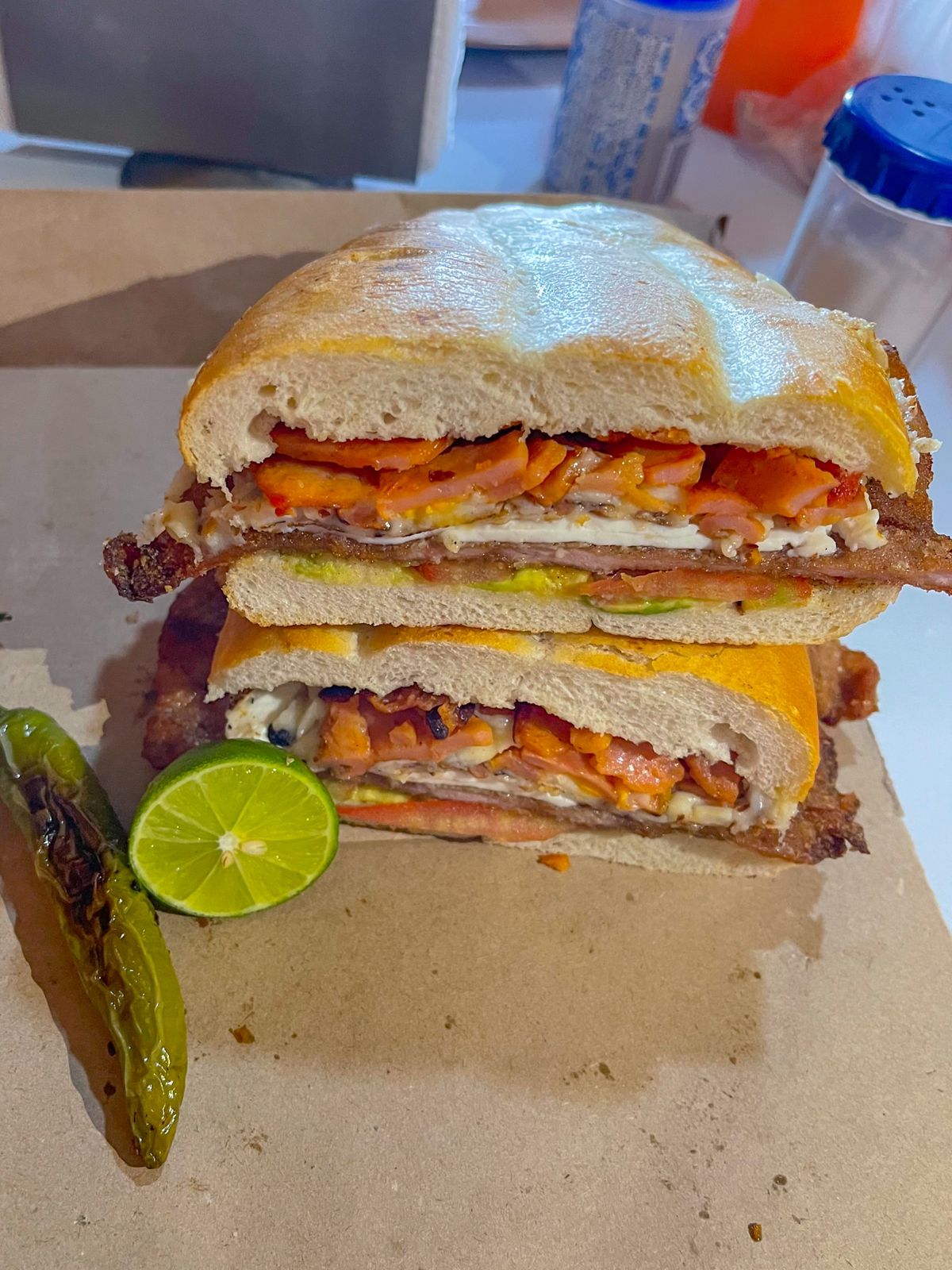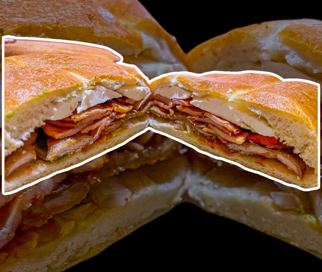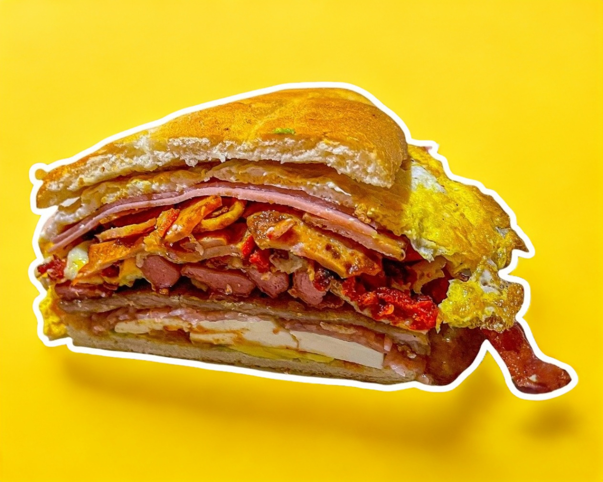 hamburguesa con carne de sirlon, queso Oaxaca, queso amarillo, jamón, queso panela, aguacate, cebolla y jitomate.