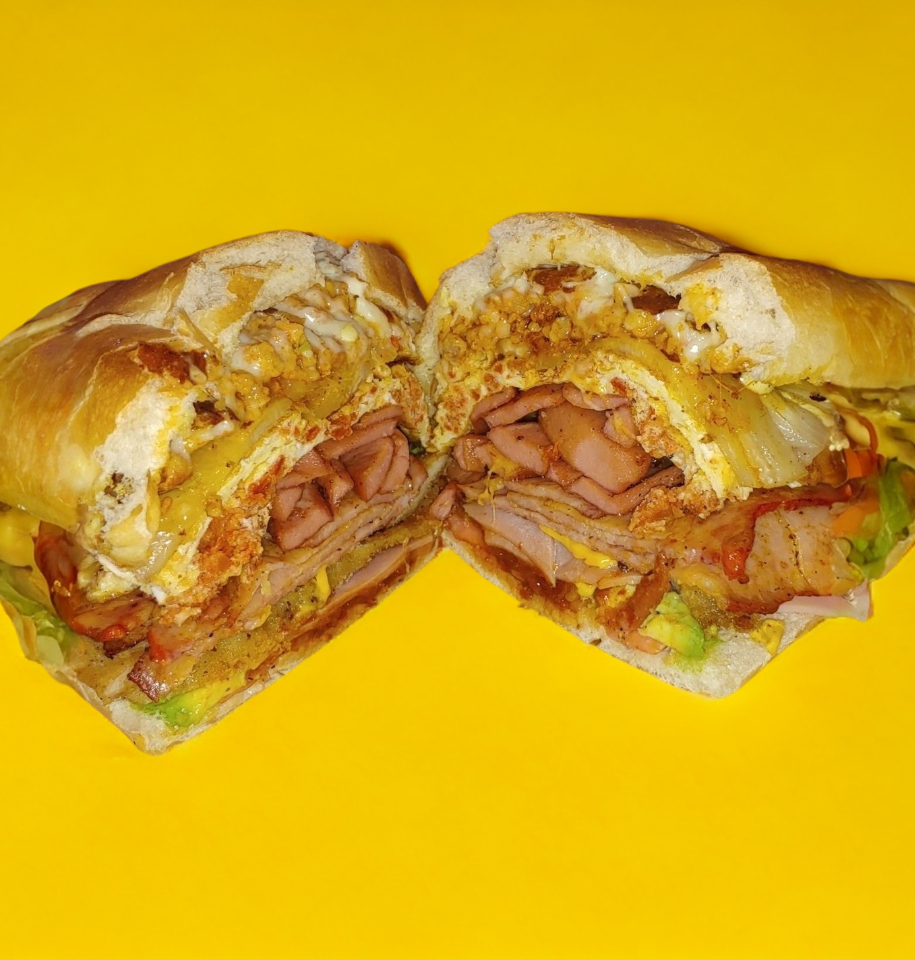 Jamón, queso oaxaca y queso amarillo, acompañadas de jitomate, aguacate y chiles jalapeños.