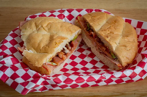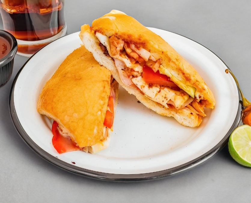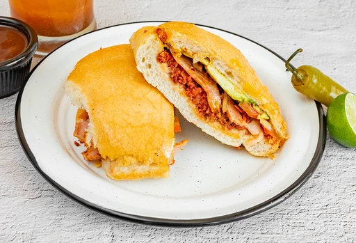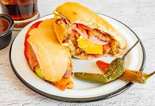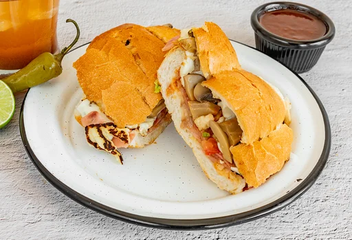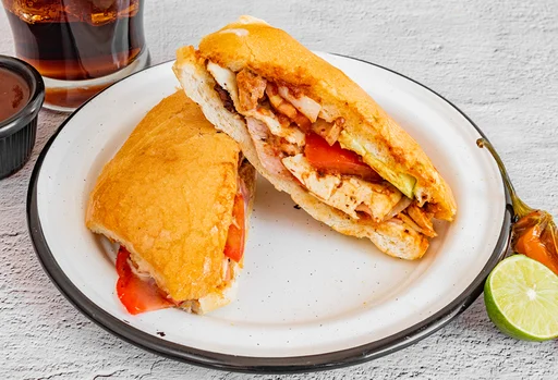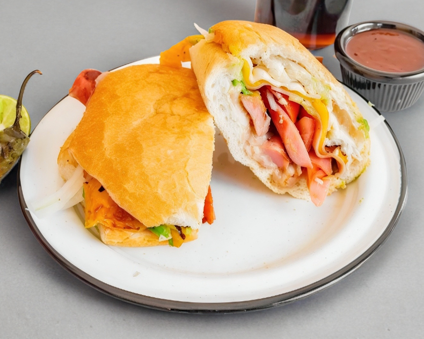 Con jamón, queso blanco, queso amarillo, salchicha, mayonesa, aguacate,frijoles, chiles jalapeños en vinagre y salsa chipotle, jitomate y lechuga.