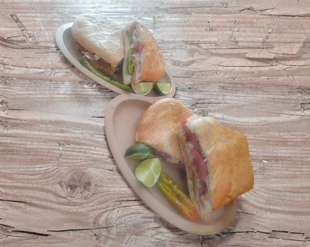 Jamón de pavo pierna piña queso, oaxaca incluye jitomate aguacate crema mayonesa y chipotle