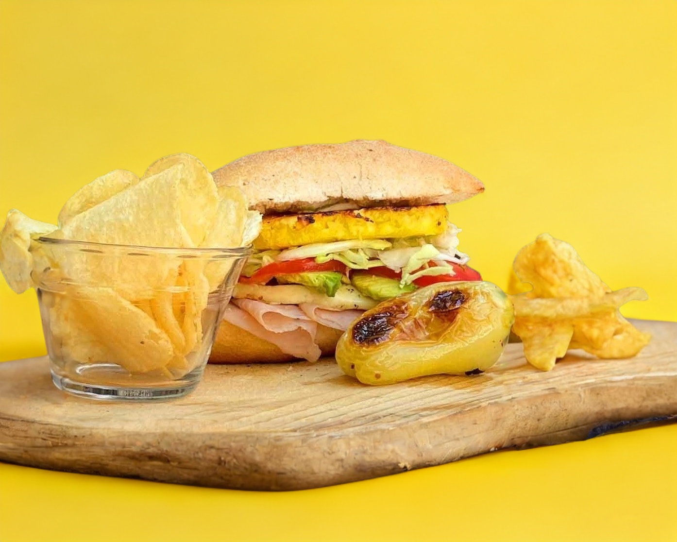 Pierna, jamon, piña, queso, mostaza, mayonesa, jitomate, cebolla aguacate y salsa chipotle.