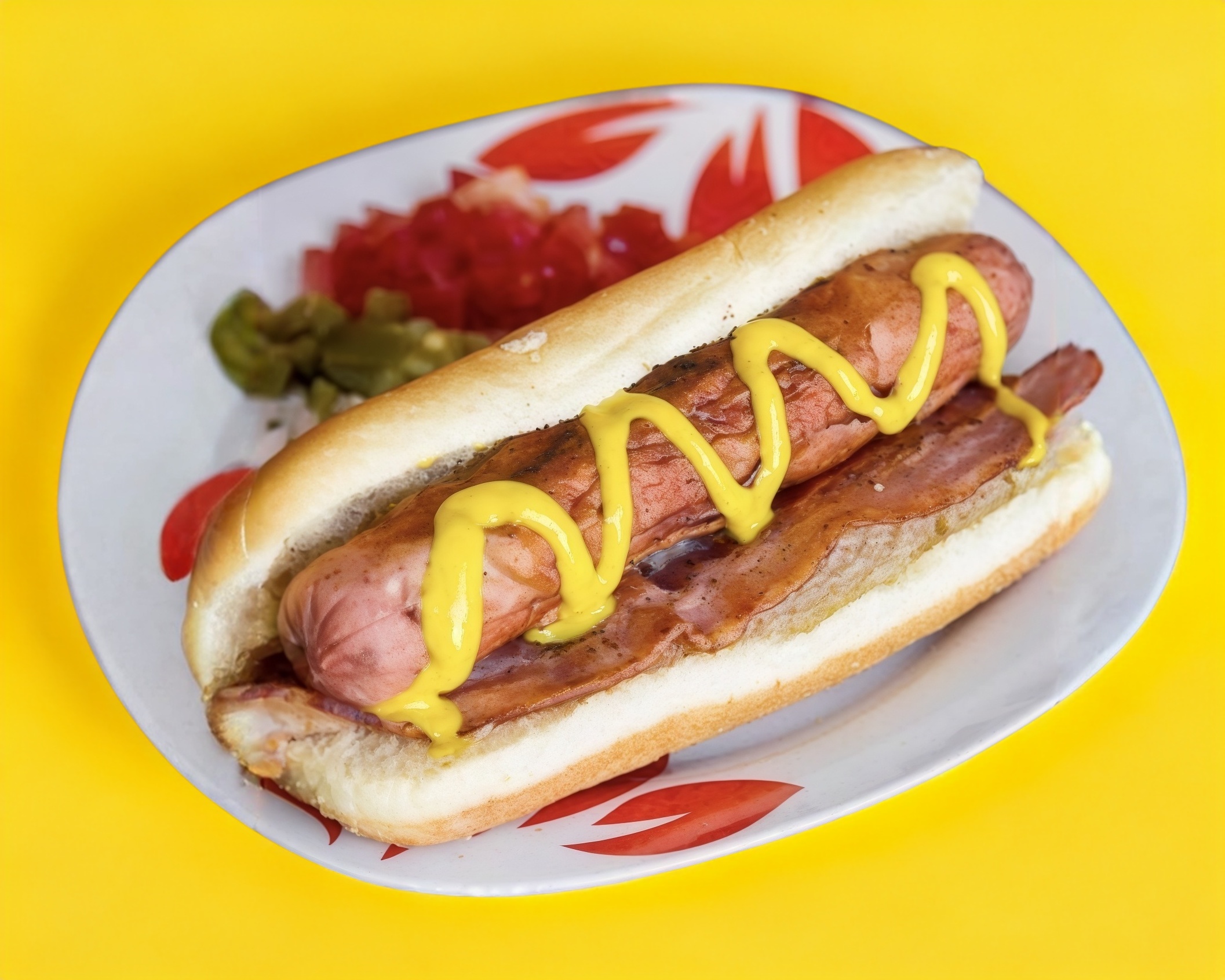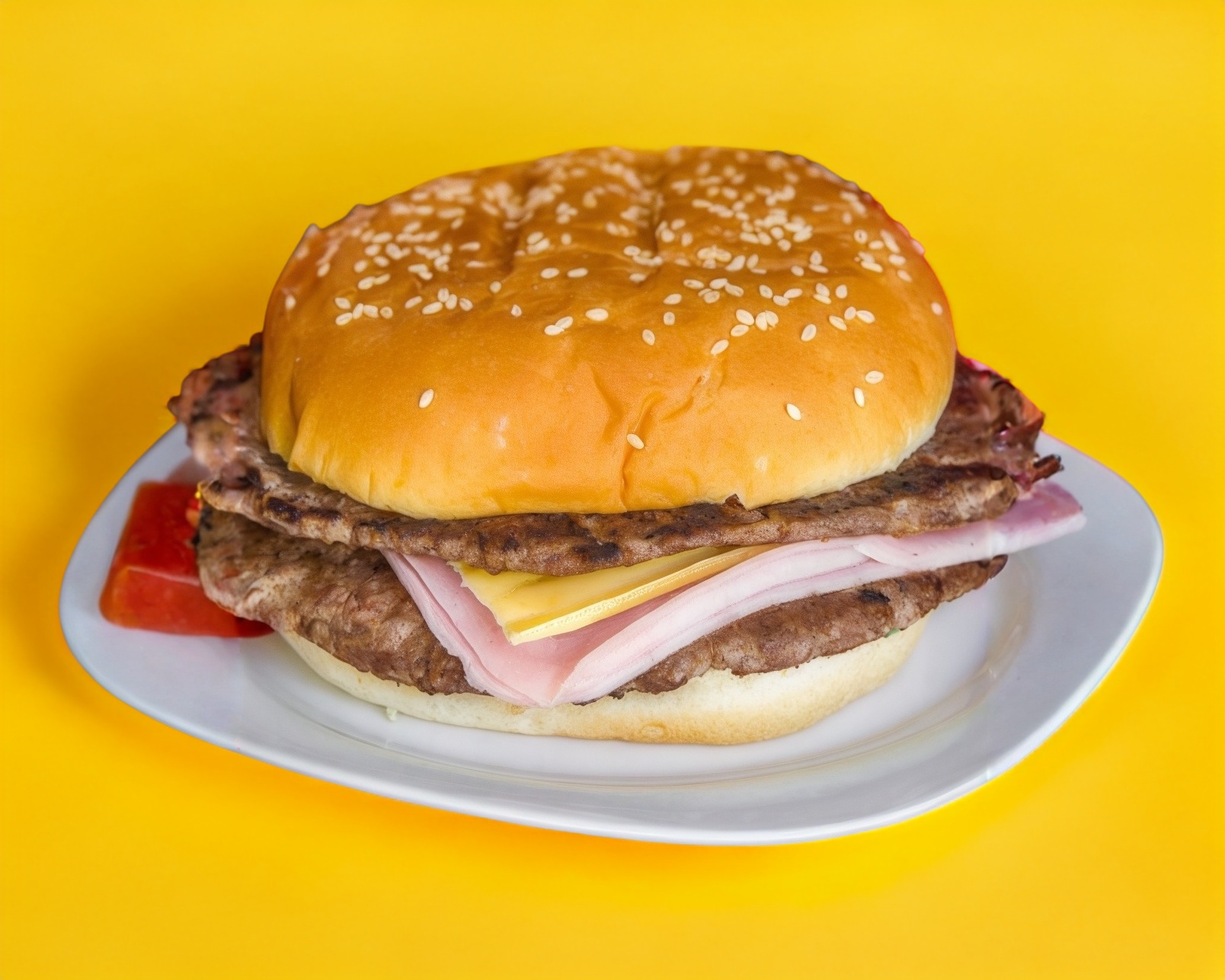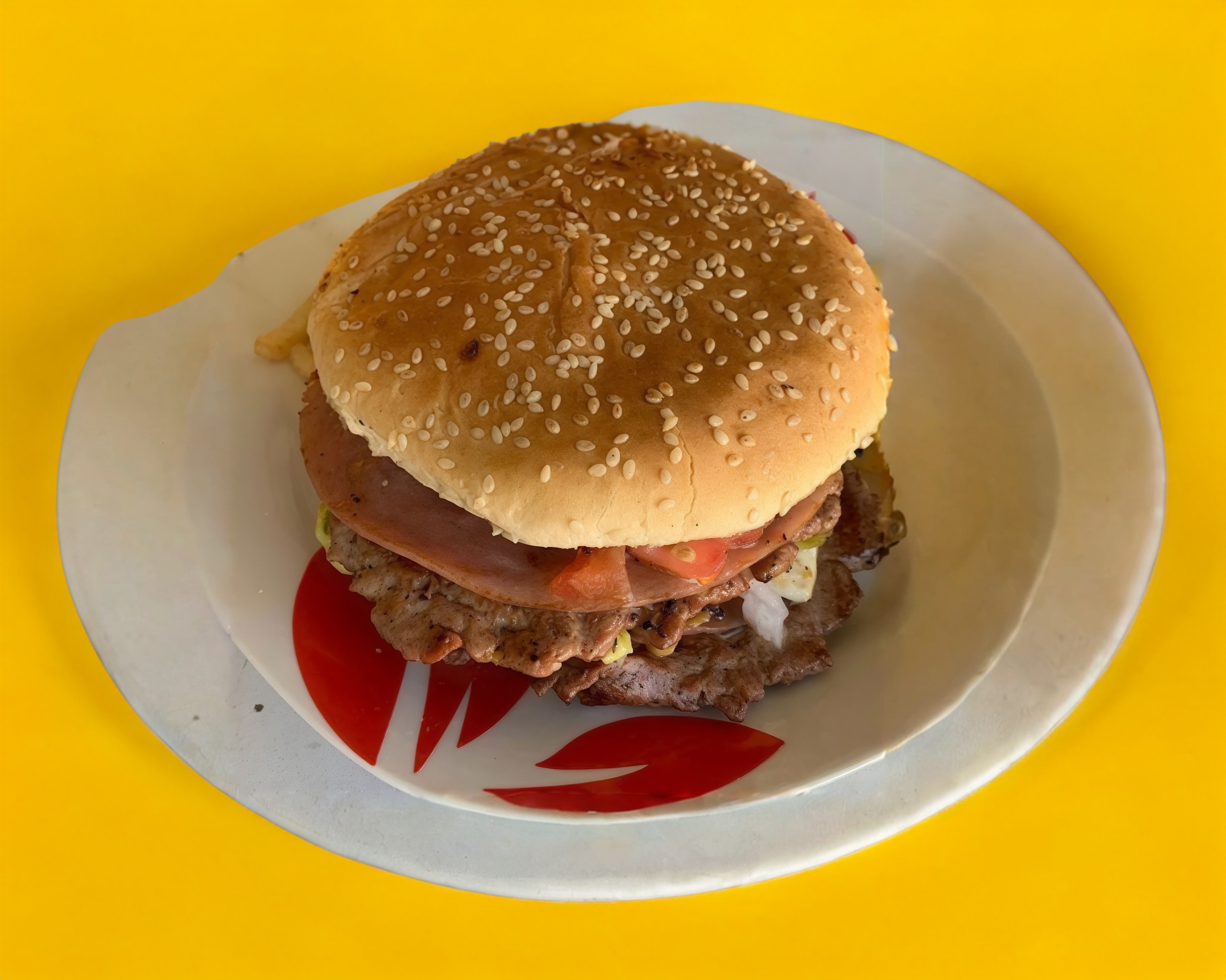 Hamburguesa preparada con queso blanco, pan grande, cátsup, mostaza y mayonesa.