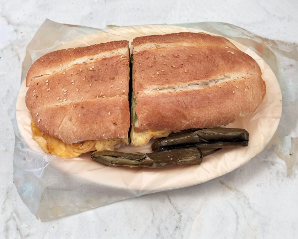 Queso panela, queso amarillo y queso oaxaca. Mayonesa, aguacate, jitomate, cebolla y salsa chipotle.