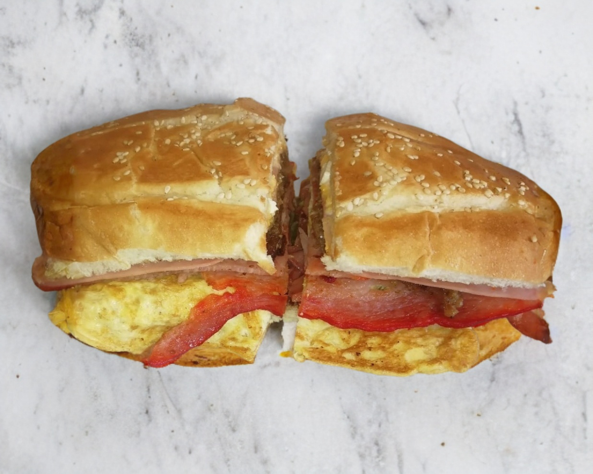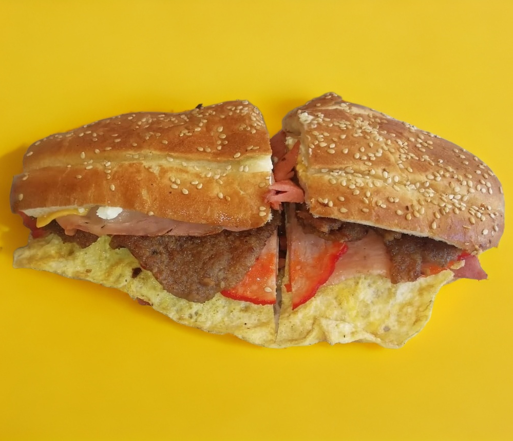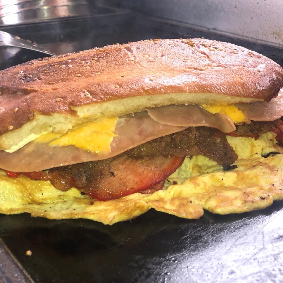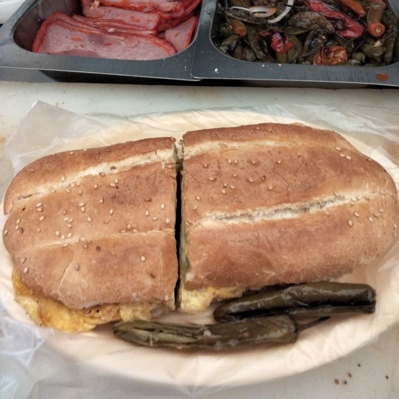 Huevo, Queso panela, queso amarillo y queso oaxaca. Mayonesa, aguacate, jitomate, cebolla y salsa chipotle.