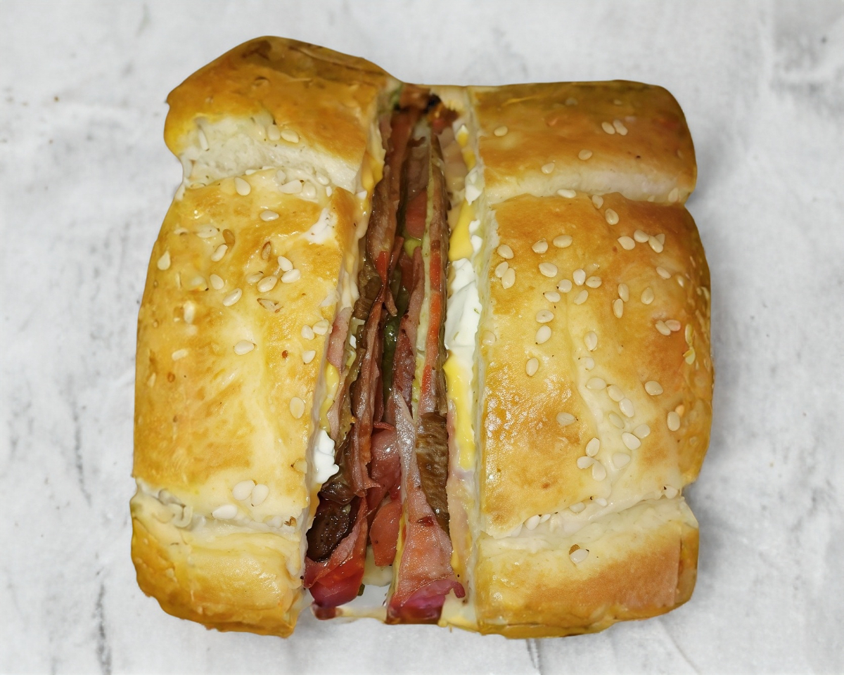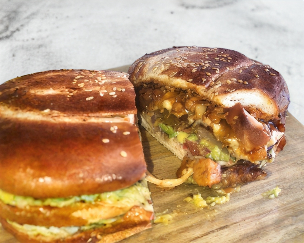 Bistec, tocino, cebolla y queso oaxaca. Mayonesa, aguacate, jitomate, cebolla y salsa chipotle.