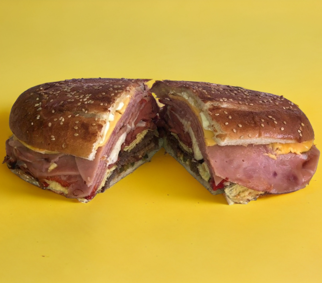 Milanesa, pierna, queso amarillo y queso oaxaca. Mayonesa, aguacate, jitomate, cebolla y salsa chipotle.