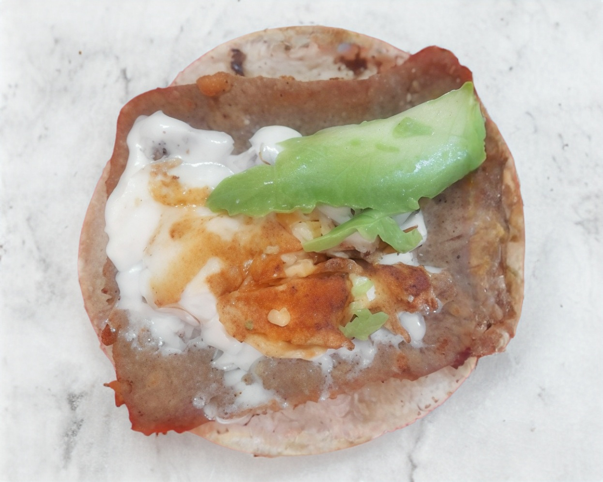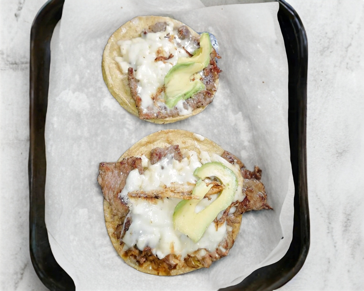 Carne al pastor, queso oaxaca, aguacate, jitomate, cebolla y salsa chipotle.