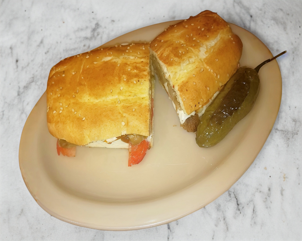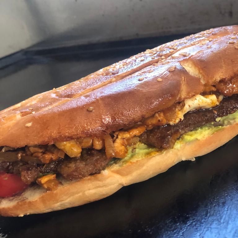 Milanesa, queso amarillo y queso oaxaca. Mayonesa, aguacate, jitomate, cebolla y salsa chipotle.