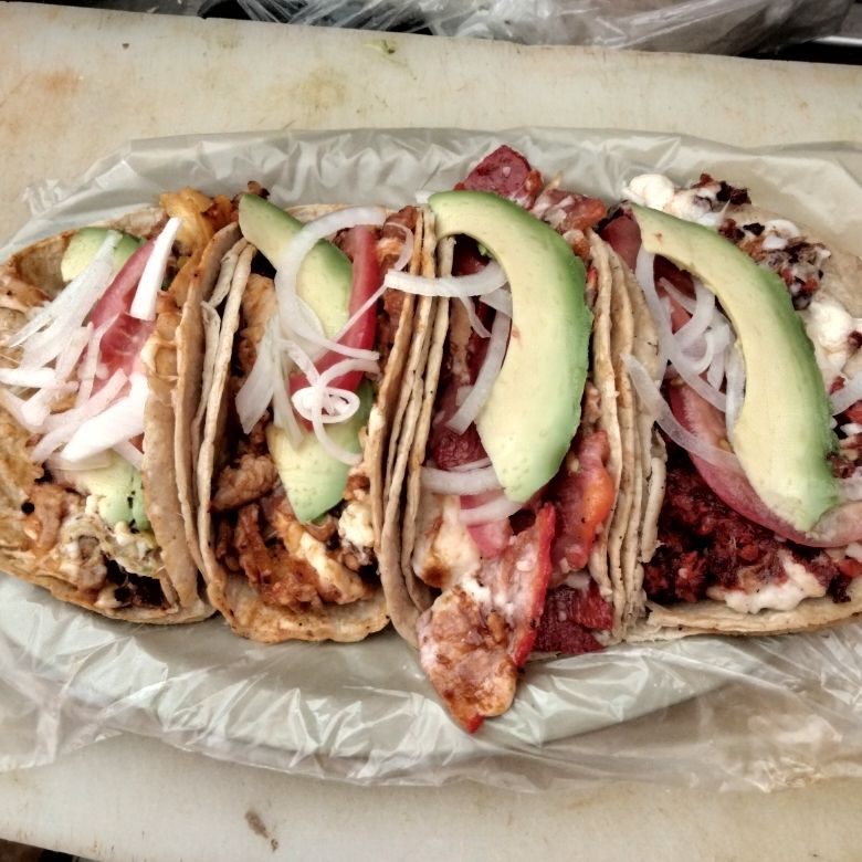 Al pastor, salchicha y queso oaxaca. Mayonesa, aguacate, jitomate, cebolla y salsa chipotle.