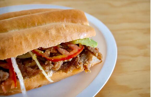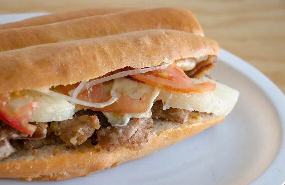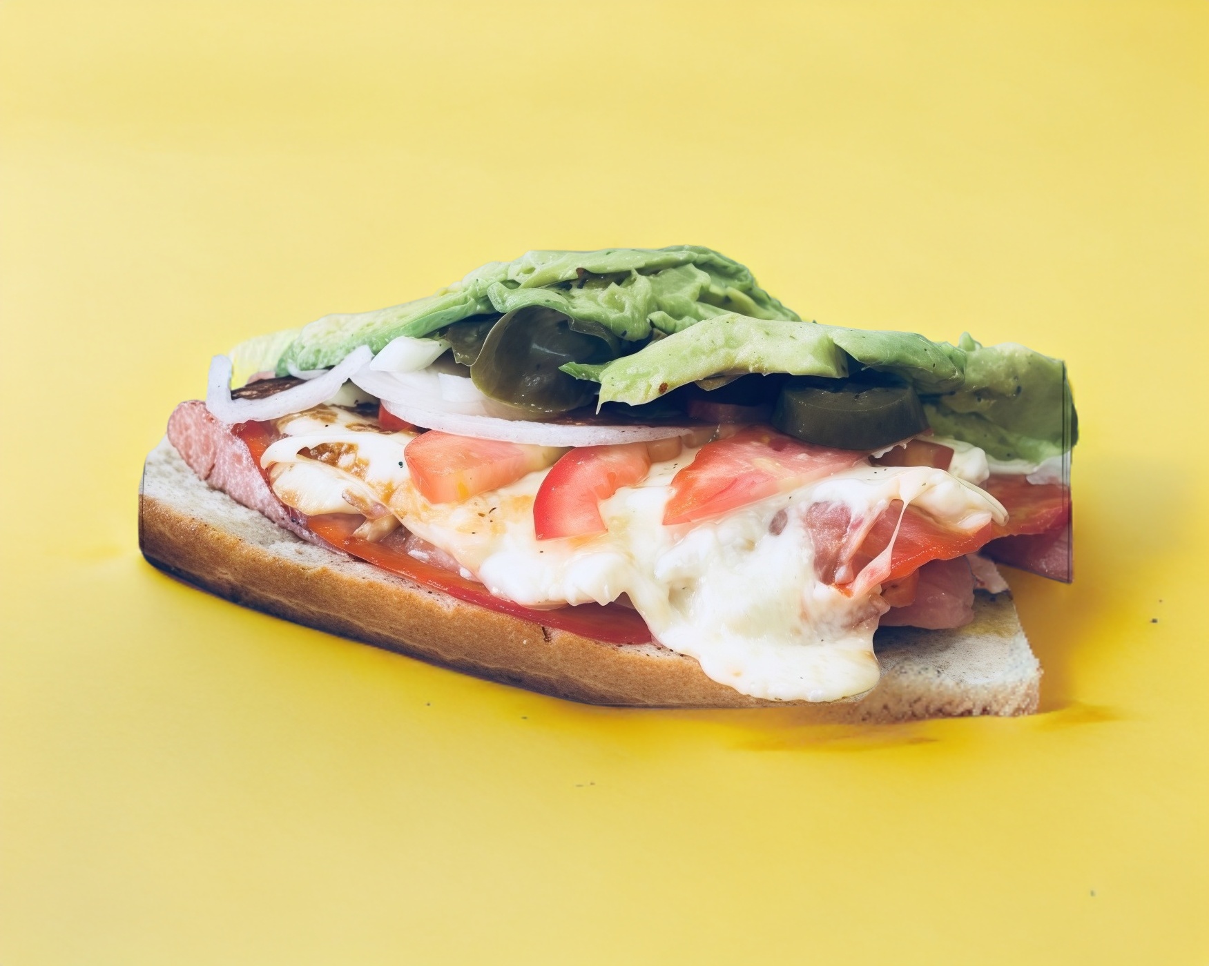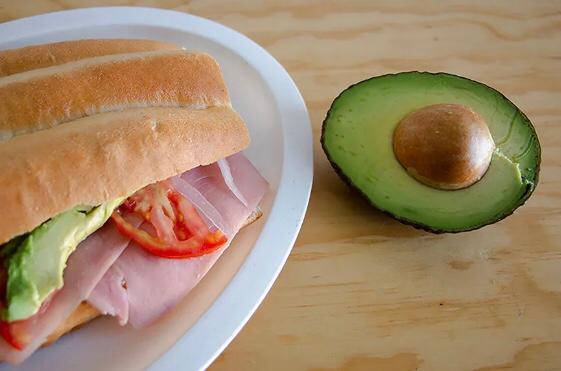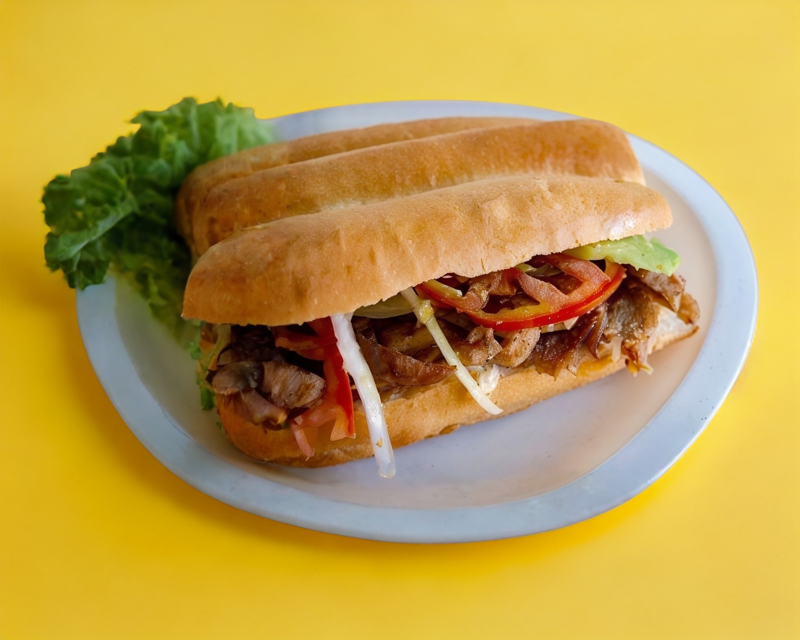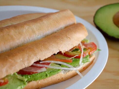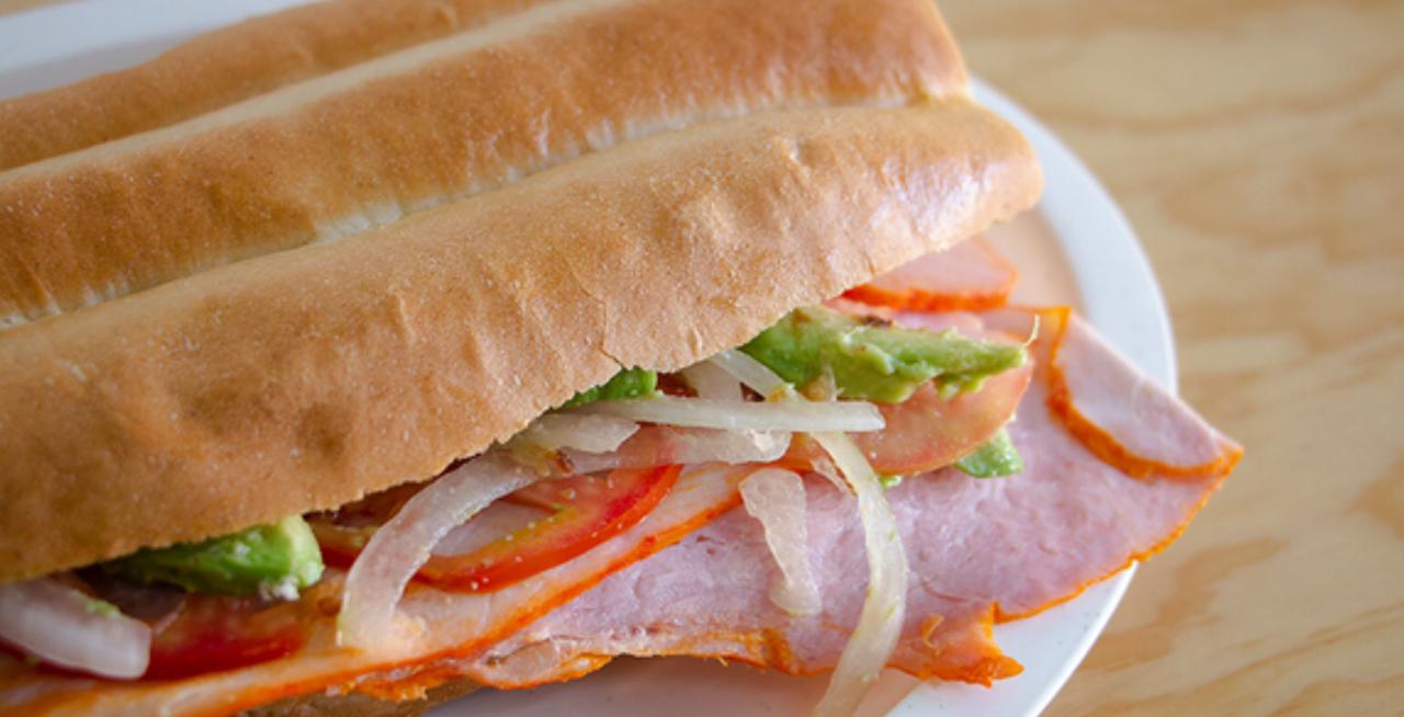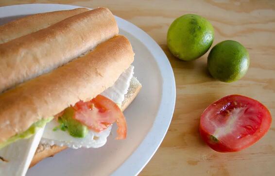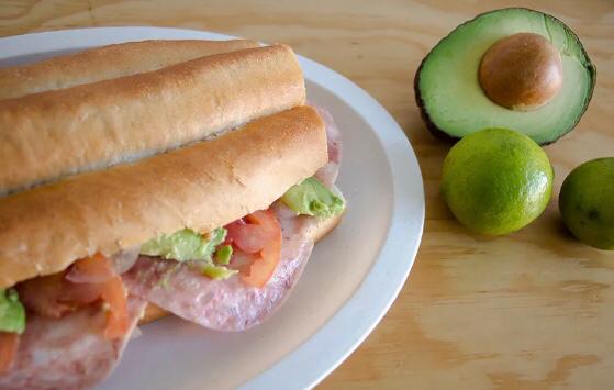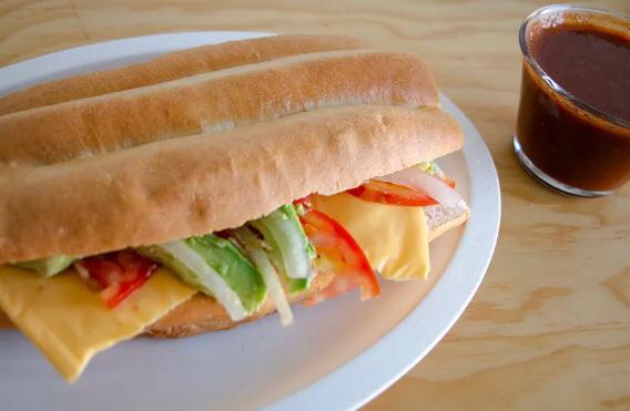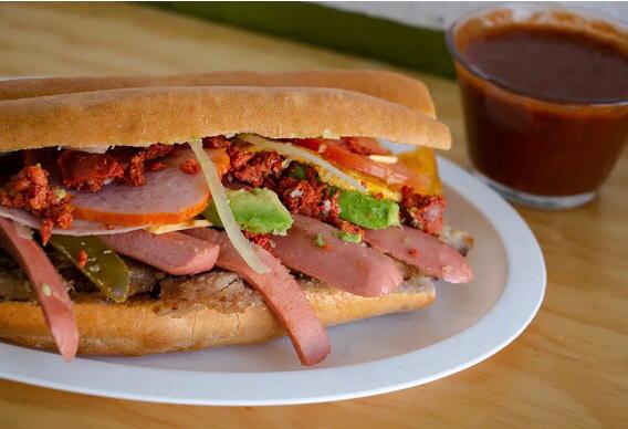Con queso panela, aguacate, mayonesa, mostaza, jitomate, cebolla, aguacate, chiles en vinagre y salsa.