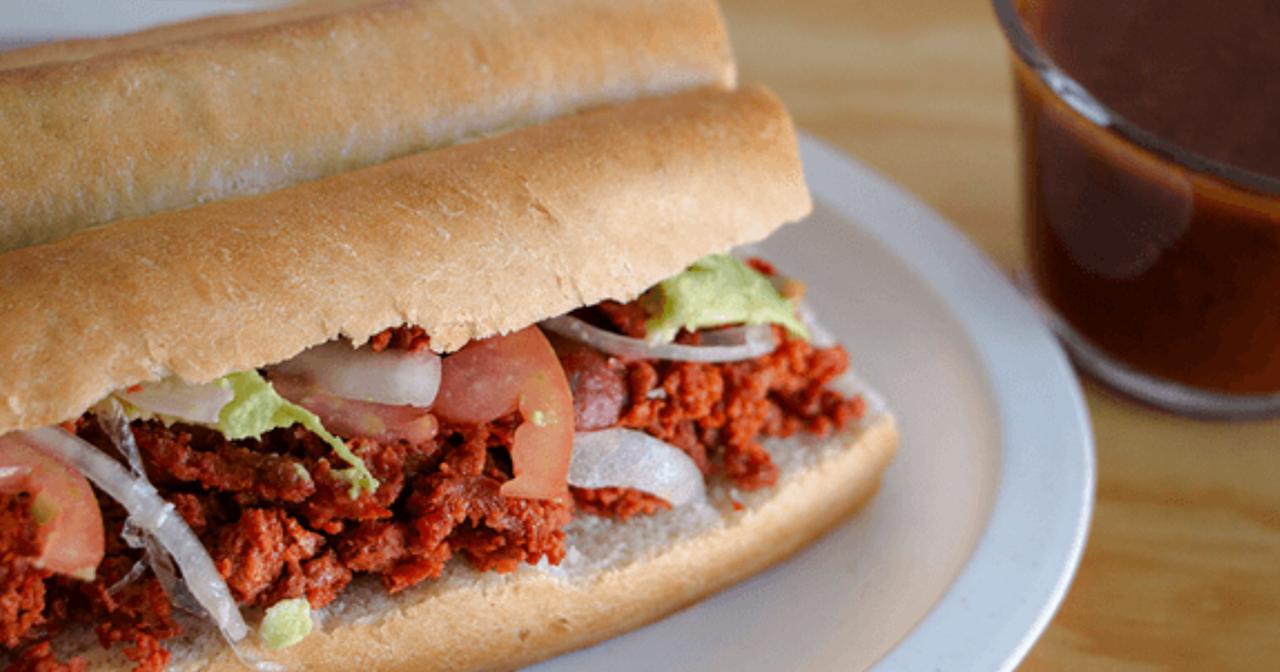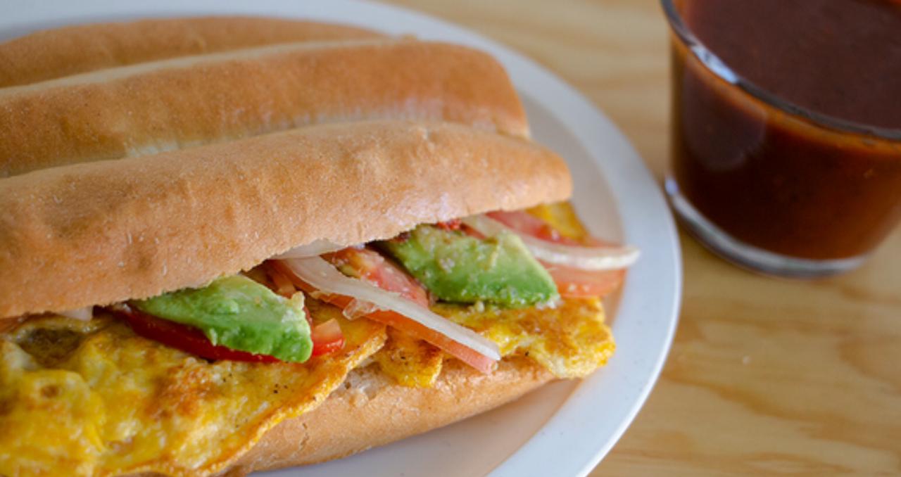 Con huevo, queso oaxaca, mayonesa, mostaza, jitomate, cebolla, aguacate, chiles en vinagre y salsa.