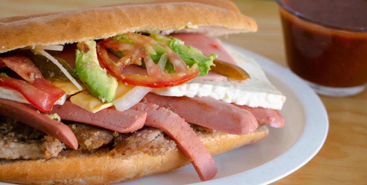 Con milanesa, pierna, salchicha, huevo, jamón, queso amarillo, oaxaca, queso de puerco, mayonesa, mostaza, jitomate, cebolla, aguacate, chiles en vinagre y salsa.