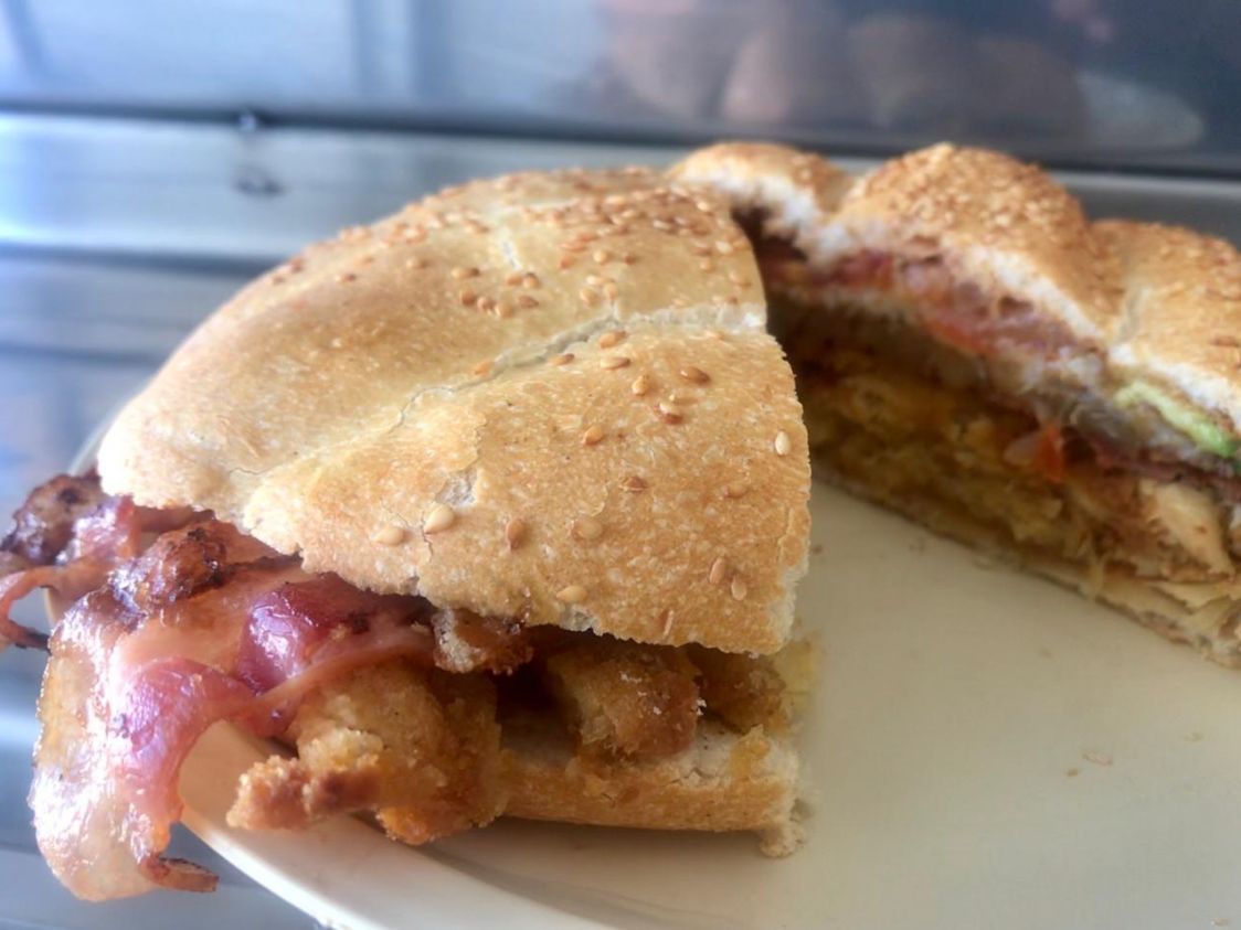 Milanesa de pollo, tocino, piña, cebolla, jitomate, aguacate, mayonesa chipotle, costra de queso, salsa XO