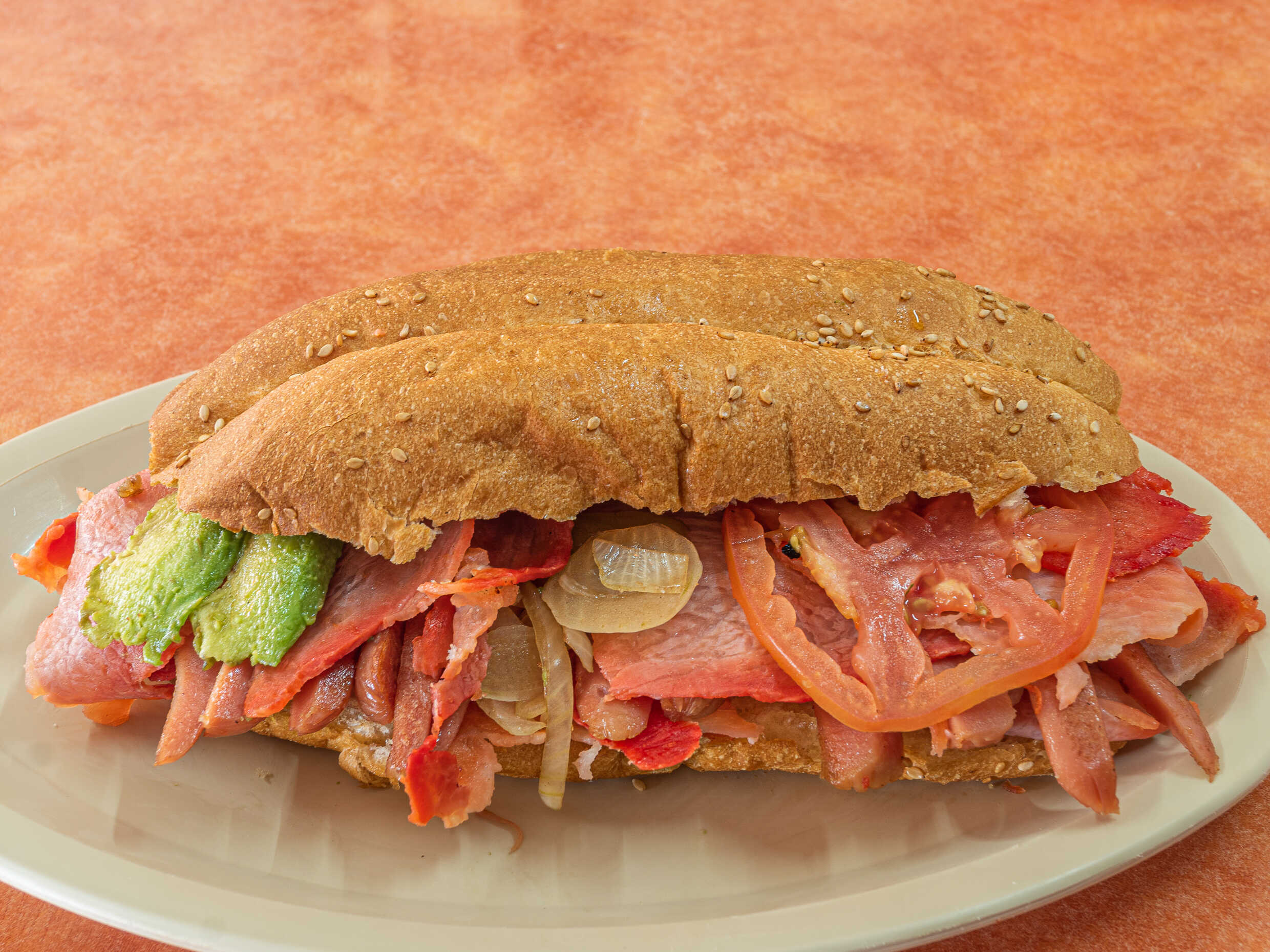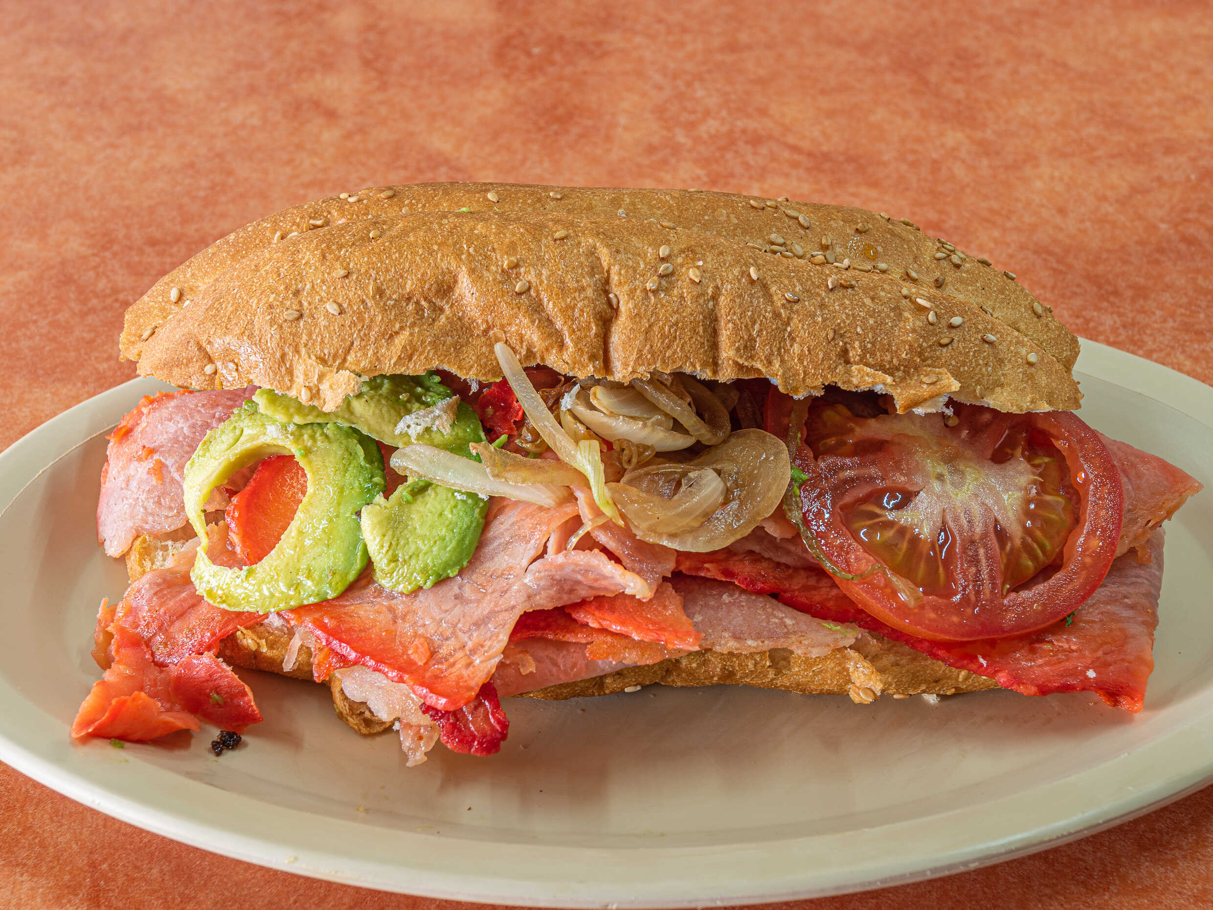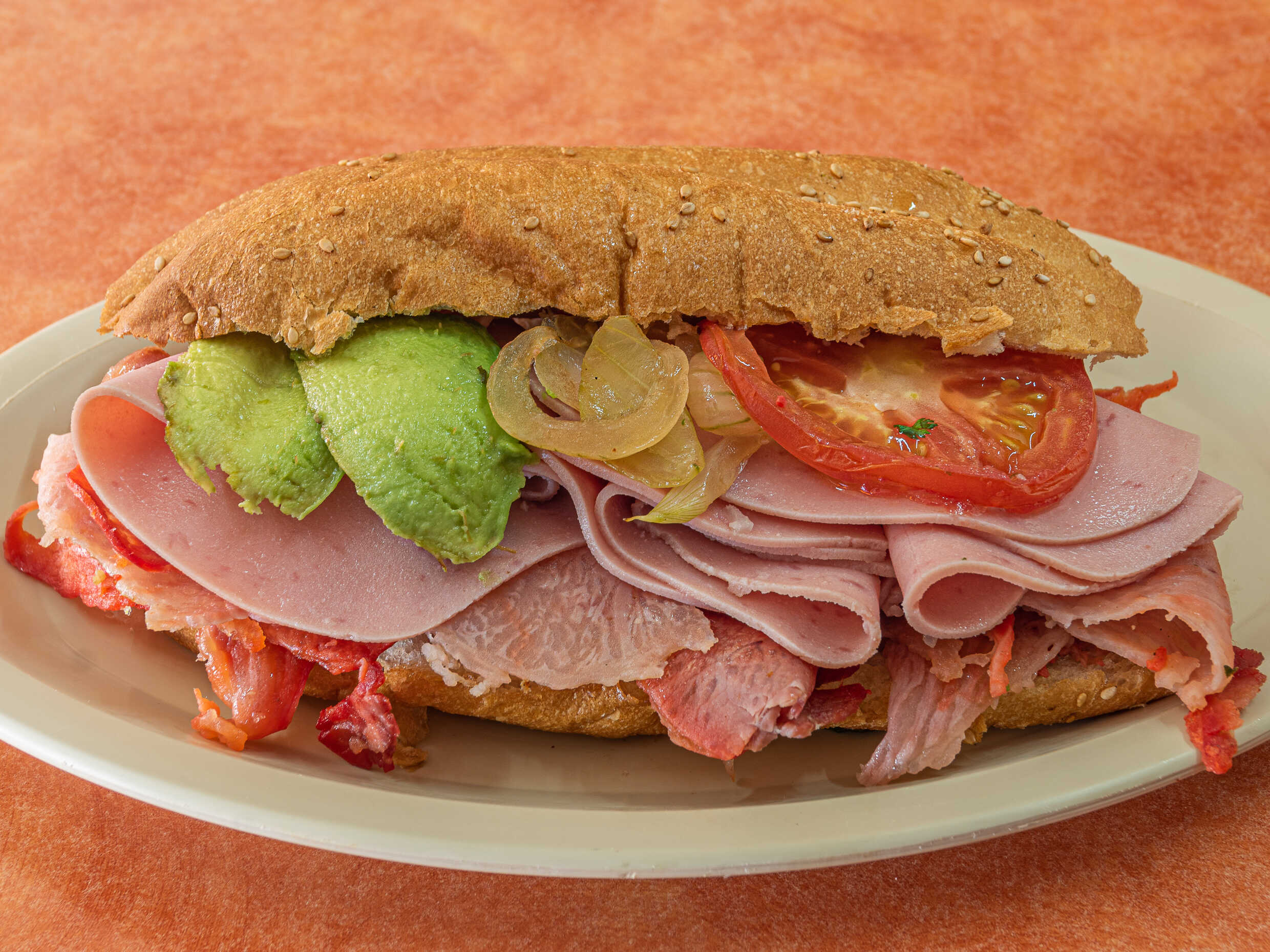 Pan extra grande con ajonjolí, jamón, queso amarillo, quesillo, mayonesa, cebolla, jitomate, aguacate y chiles en vinagre.