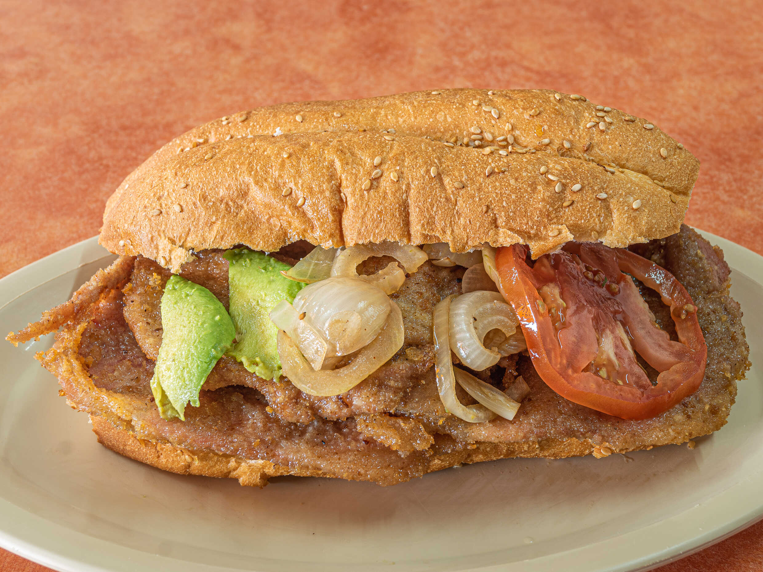Pan extra grande con ajonjolí, milanesa, queso, mayonesa, cebolla, jitomate, aguacate y chiles en vinagre.