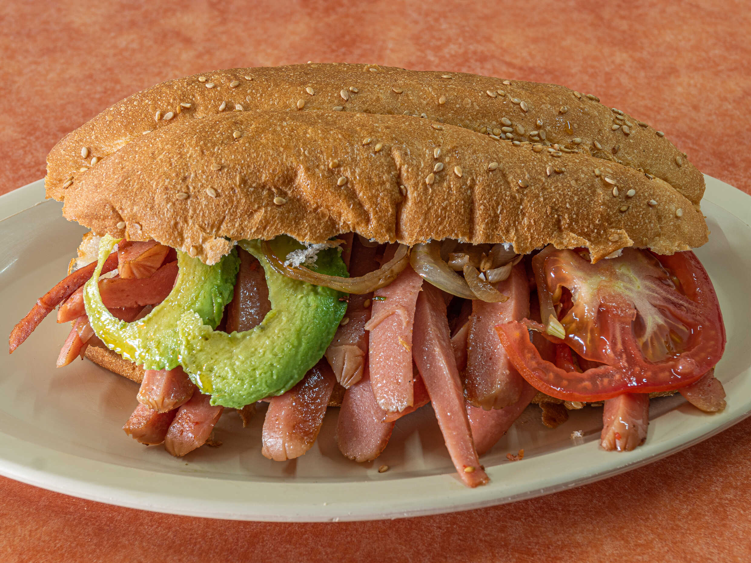 Carne selecta de arrachera (150gr), salchicha, jamón, tocino, pierna española, queso amarillo, queso oaxaca, jitomate, cebolla, chiles, aguacate en un pan artesanal con ajonjolí negro. cátsup, mostaza y mayonesa.