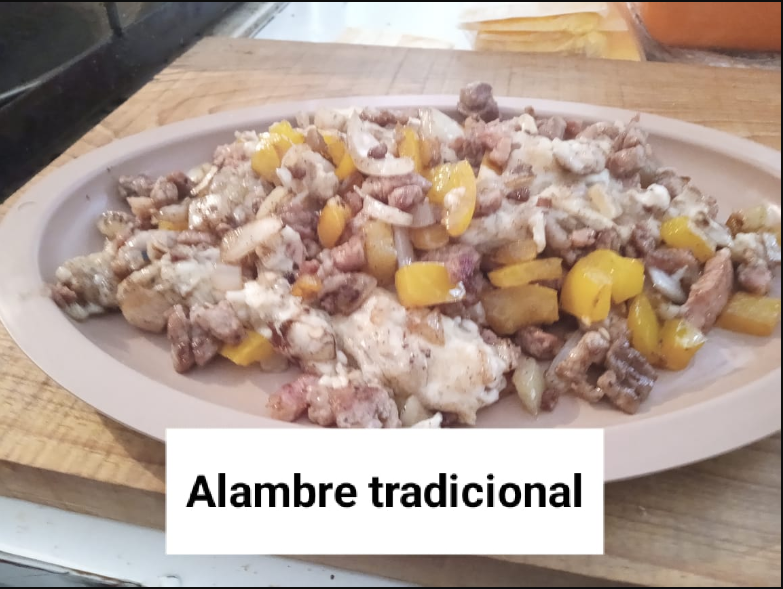 Pimiento, cebolla, tocino, bistec y queso oaxaca.