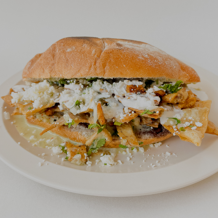 Bolillo grande con totopos frescos hechos en casa, con frijoles, queso, crema, cilantro y cebolla. Escoge tu salsa y proteina