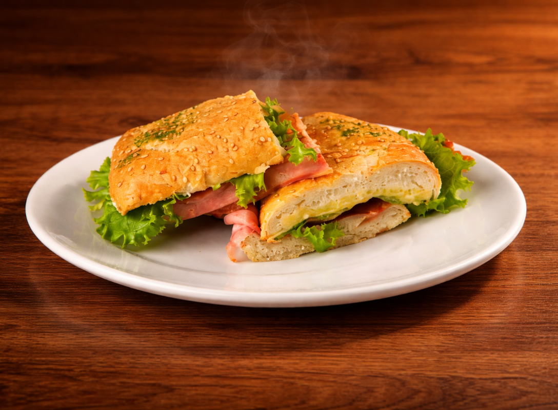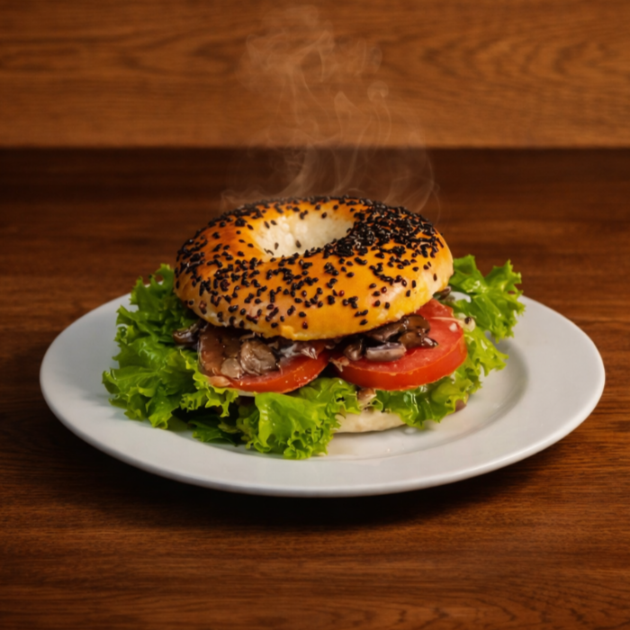 Bagel con lechuga, tomate y carne. Escoge el bagel de tu preferencia.