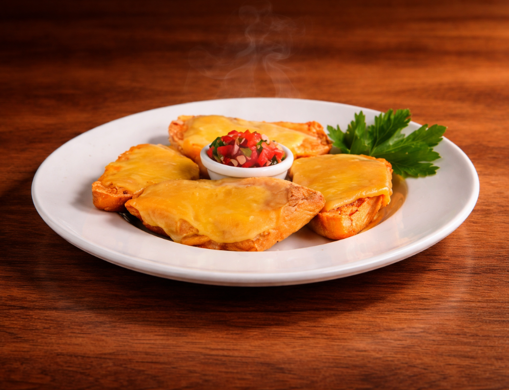 Molletes con pico de gallo, preparación de la casa, porción personal.