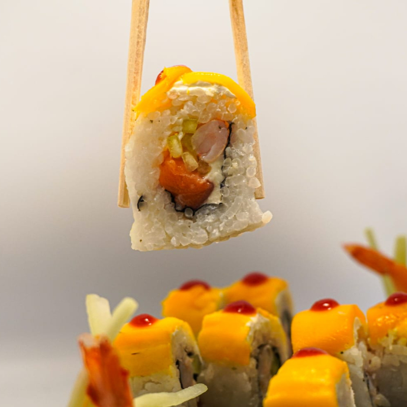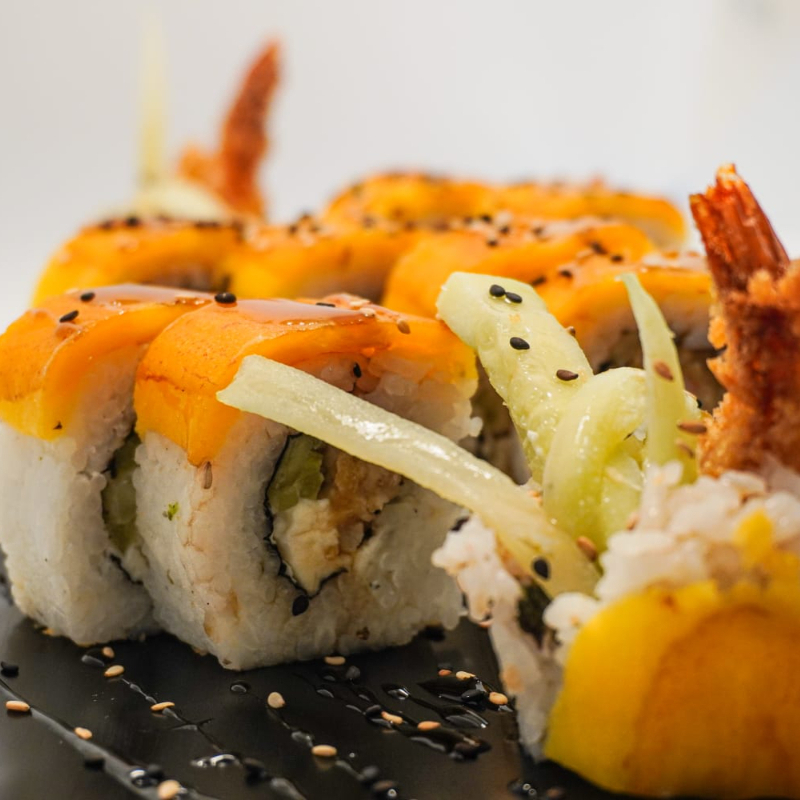 salmon , camaron queso crema y pepino por dentro . mango y salsa sriracha por fuera