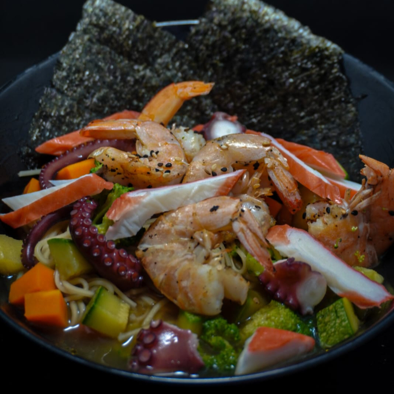 mariscos , vegetales , shitake , cebollin , aceite de ajonjoli , alga nori
