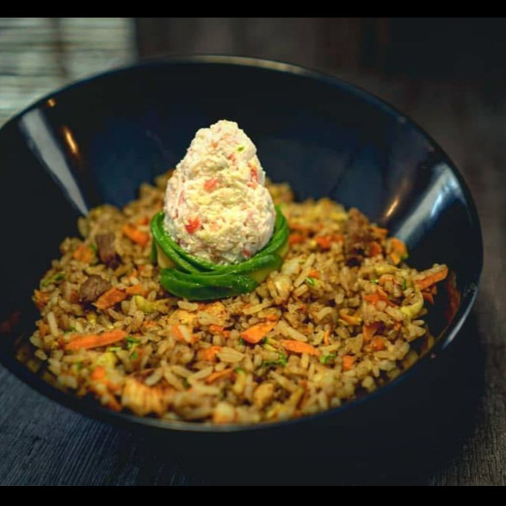 arros frito con verduras , pollo , res , camaron , soya y un toque de ajo