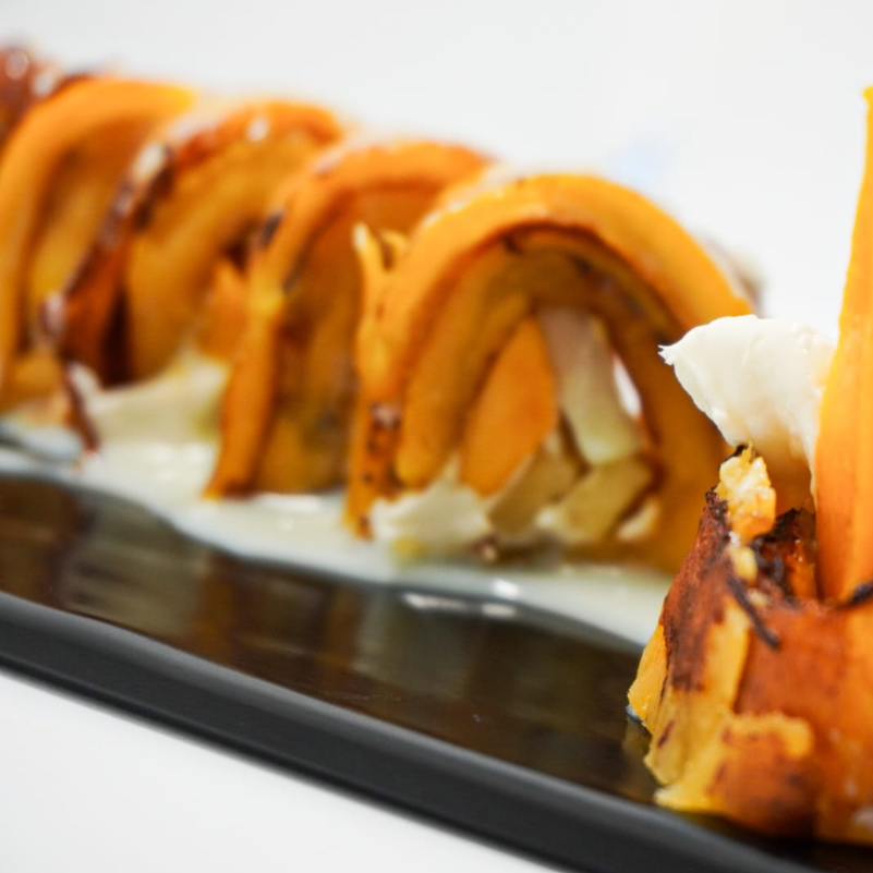 pulpo zarandeado , pepino , aguacatepor dentro . nevado y ajonjoli por fuera