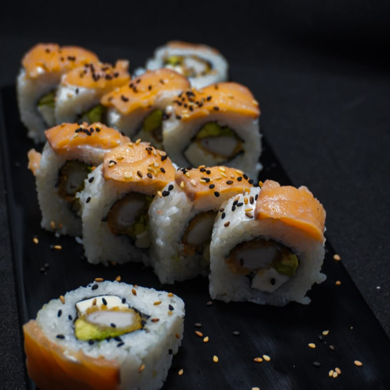 salmon , queso crema , aguacate por dentro . ajonjoli por fuera