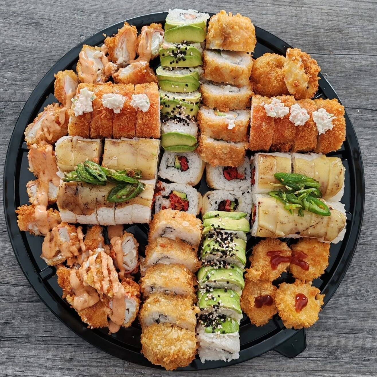 salmon , camaron , queso crema y pepino por dentro . cangrejo spicypor fuera
