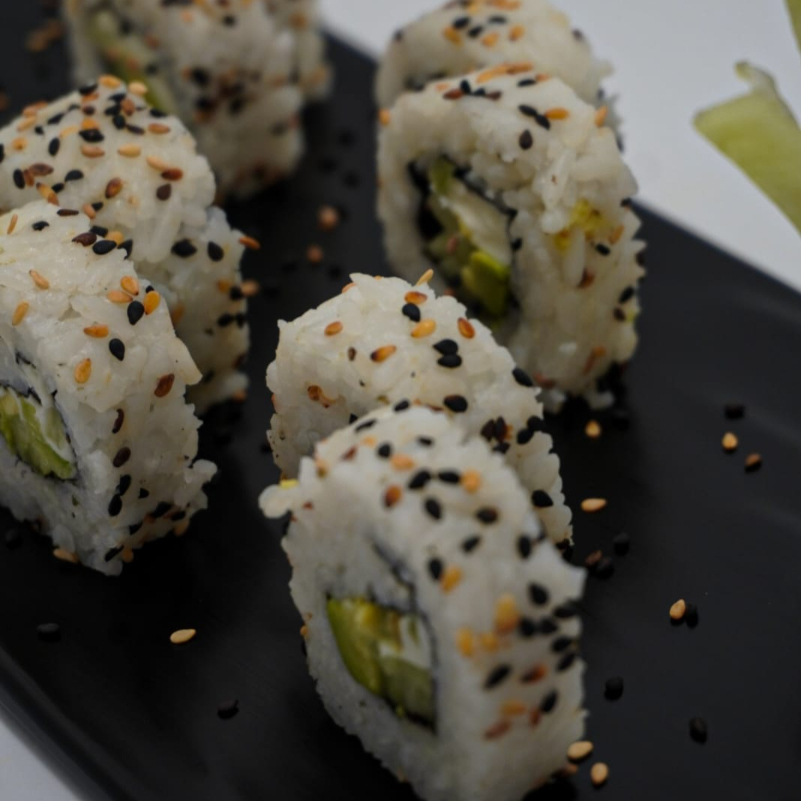 aguacate , queso crema , pepino por dentro . ajonjoli por fuera
