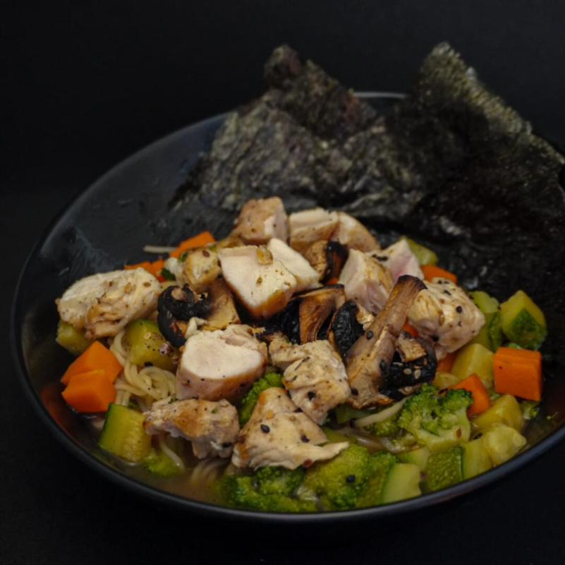 pechuga de pollo , vegetales , shitake , cebollin , aceite de ajonjoli , alga nori