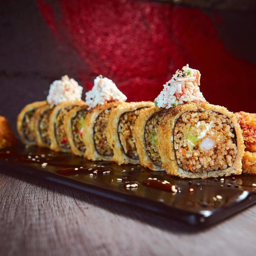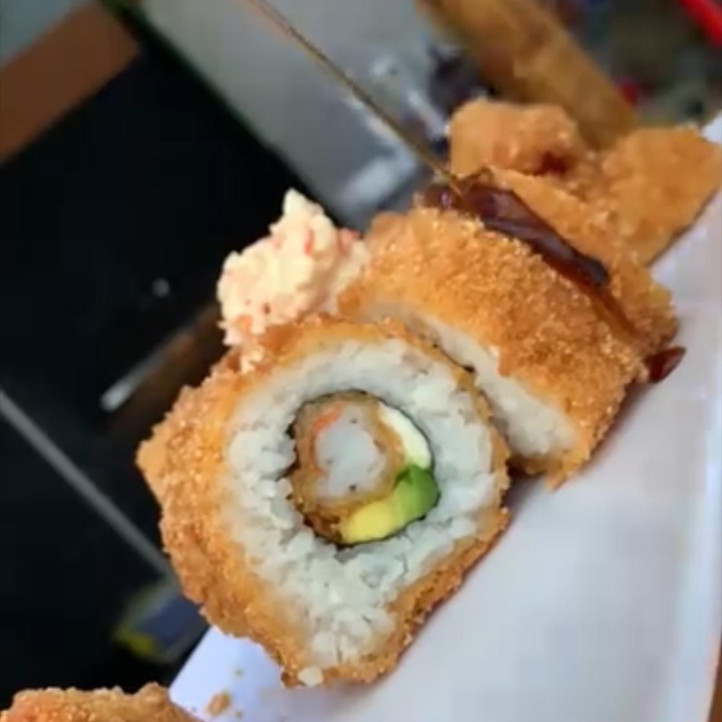arroz frito , camaron empanizado , queso crema y aguacate por dentro . empanizado por fuera con tampico y salsa de anguila