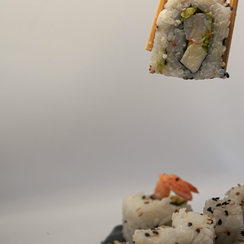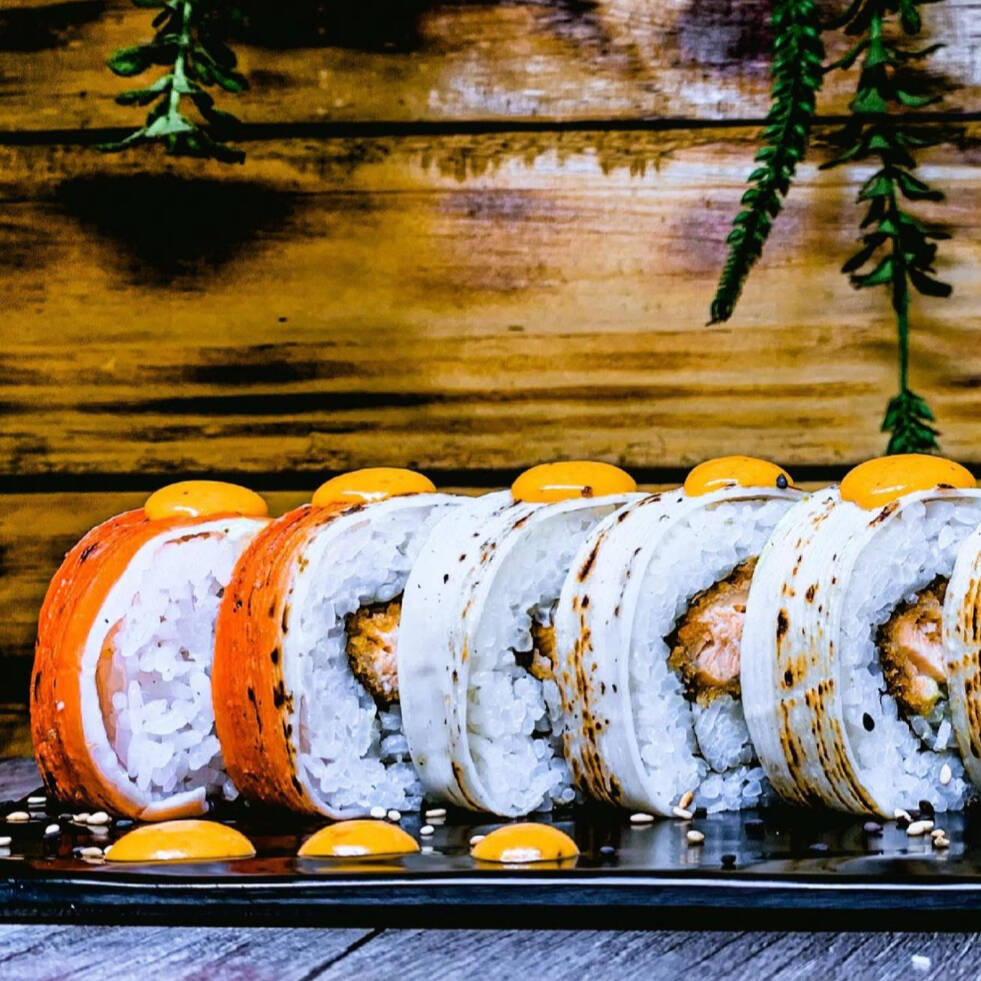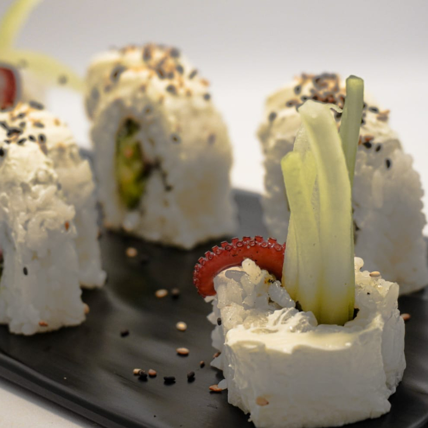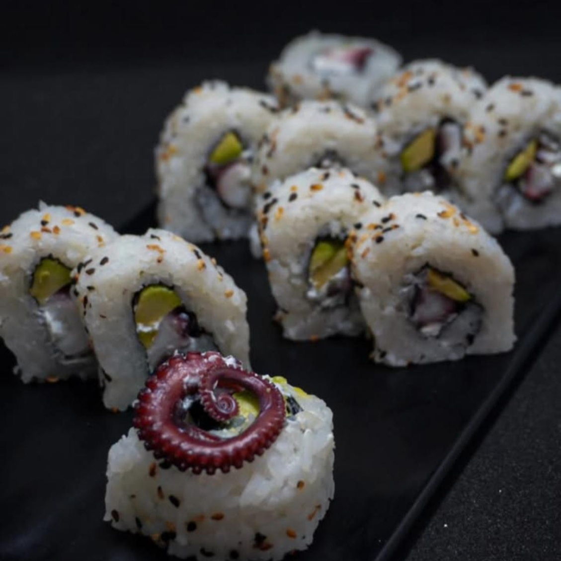 pulpo , queso crema , aguacate por dentro . ajonjoli por fuera