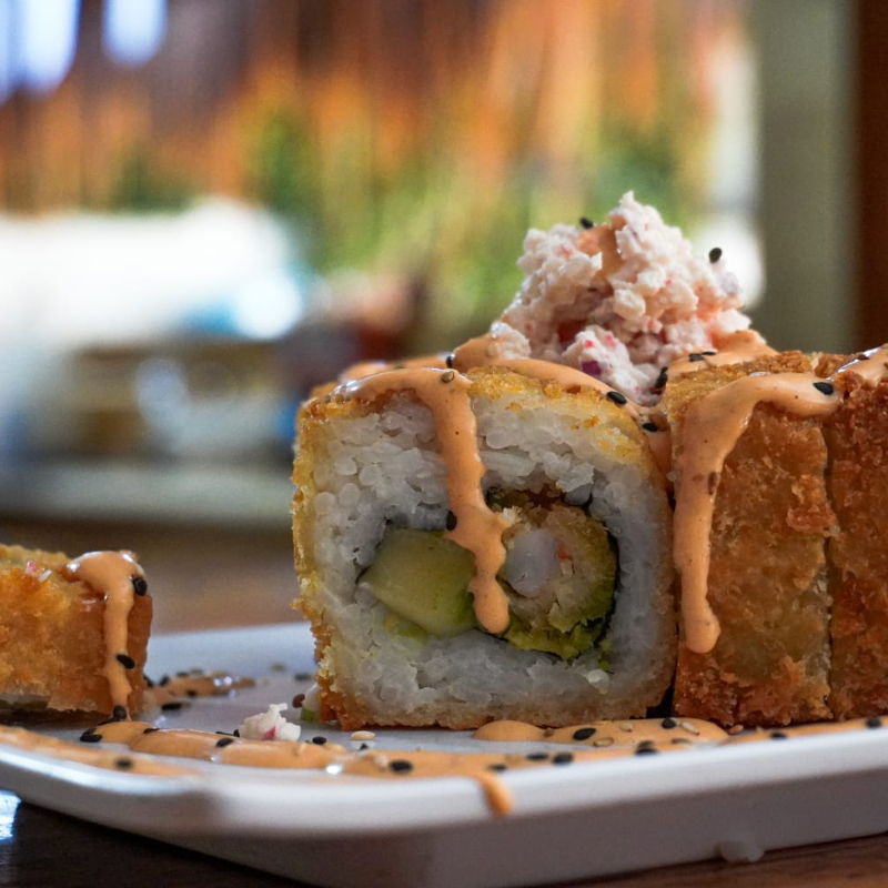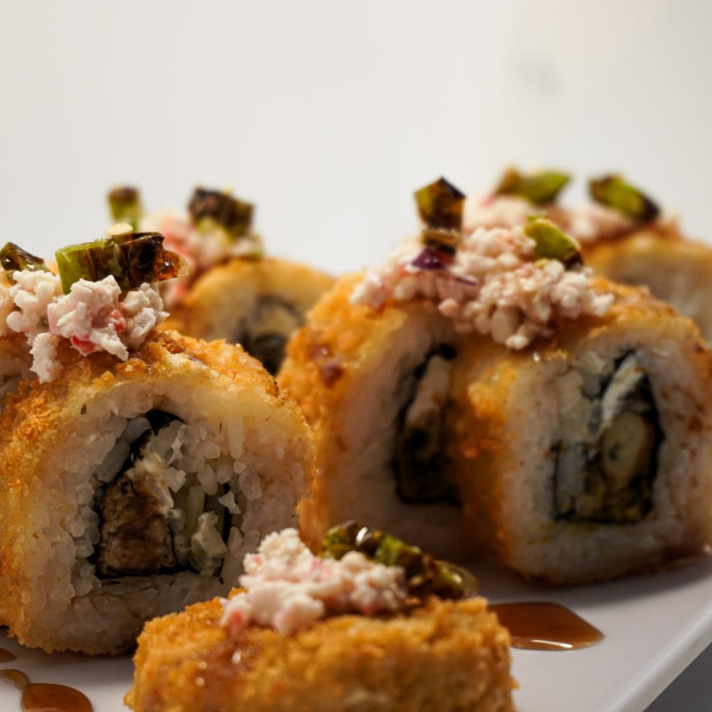 camaron empanizado , queso crema y aguacate por dentro . cangrejo spicy por fuera