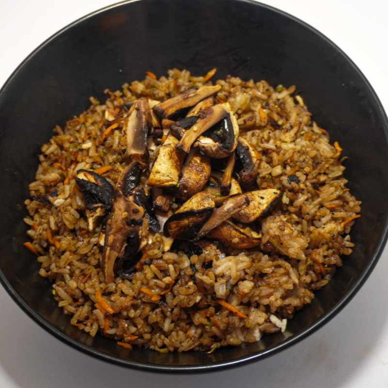 arroz frito con verduras , champiñon , soya y un toque de ajo