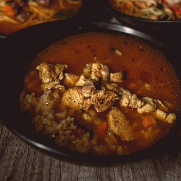 sopa oriental con un toque tropikal picante , pollo arroz , zanahoria , champiñones y un toque de aceite de ajonjoli