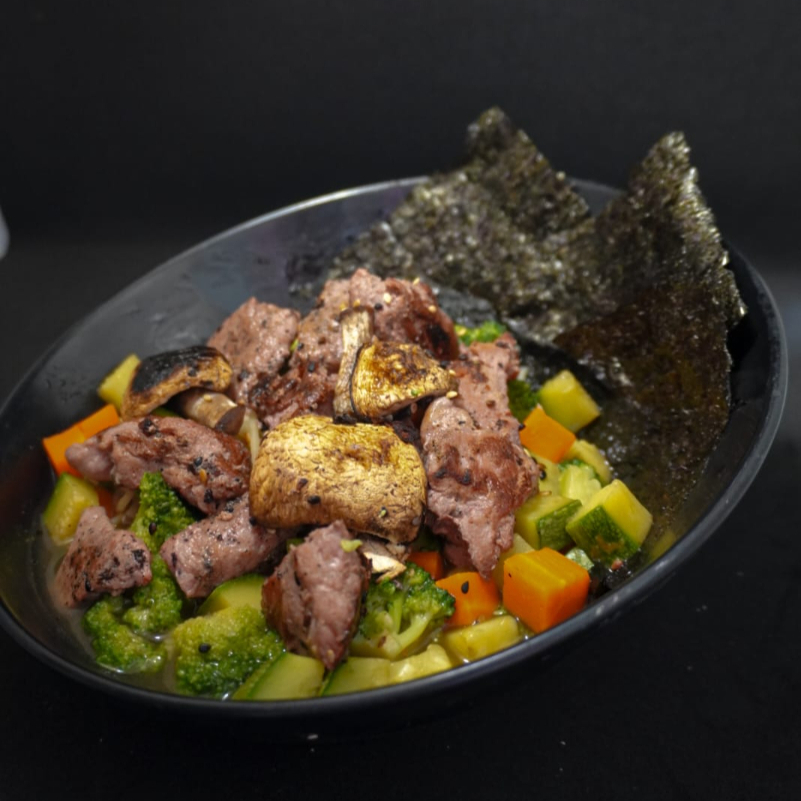 res, vegetales , shitake , cebollin , aceite de ajonjoli , alga nori