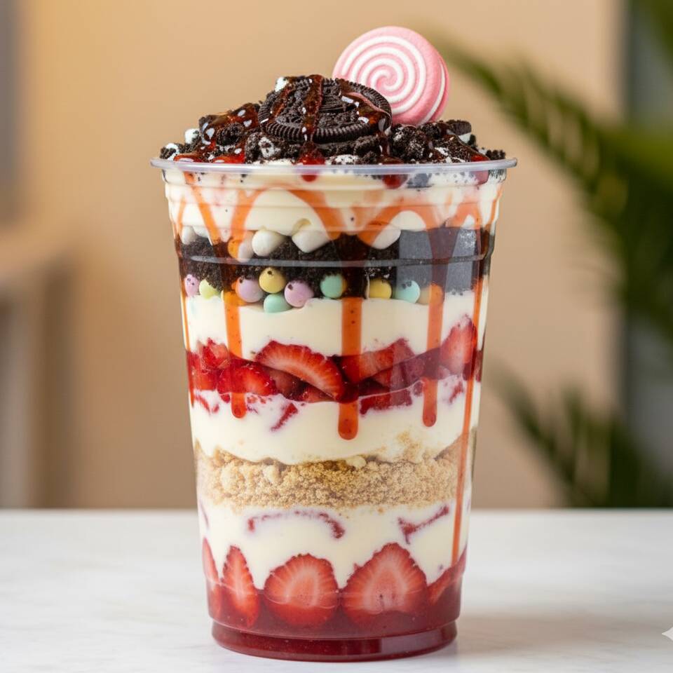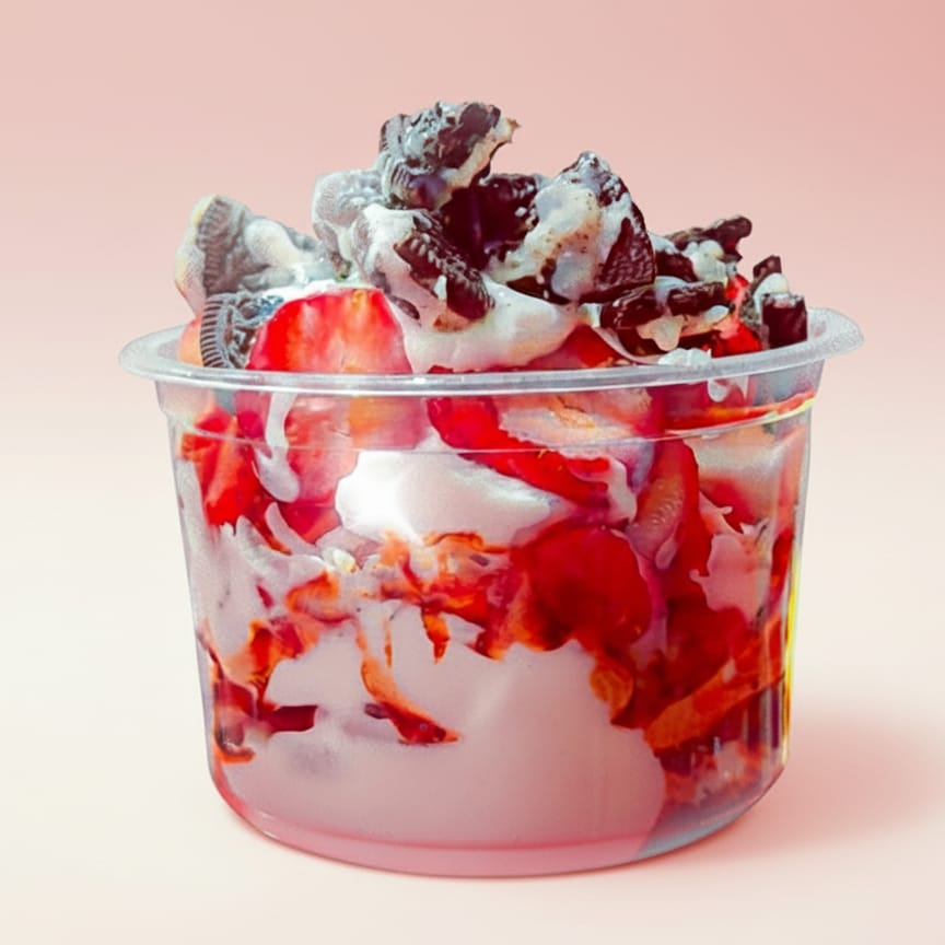 Las mas deliciosas fresas acompañadas de 4 capas de toppings de tu eleccion, 2 jarabes y tu galleta a elegir